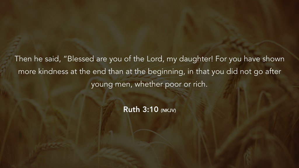 daughter! For you have shown more kindness at the end than at the beginning, in that you did not go after young men, whether poor or rich. Ruth 3:10 (NKJV)
