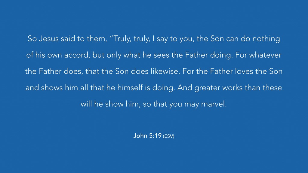 you, the Son can do nothing of his own accord, but only what he sees the Father doing. For whatever the Father does, that the Son does likewise. For the Father loves the Son and shows him all that he himself is doing. And greater works than these will he show him, so that you may marvel. John 5:19 (ESV)