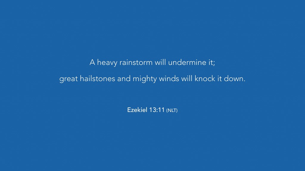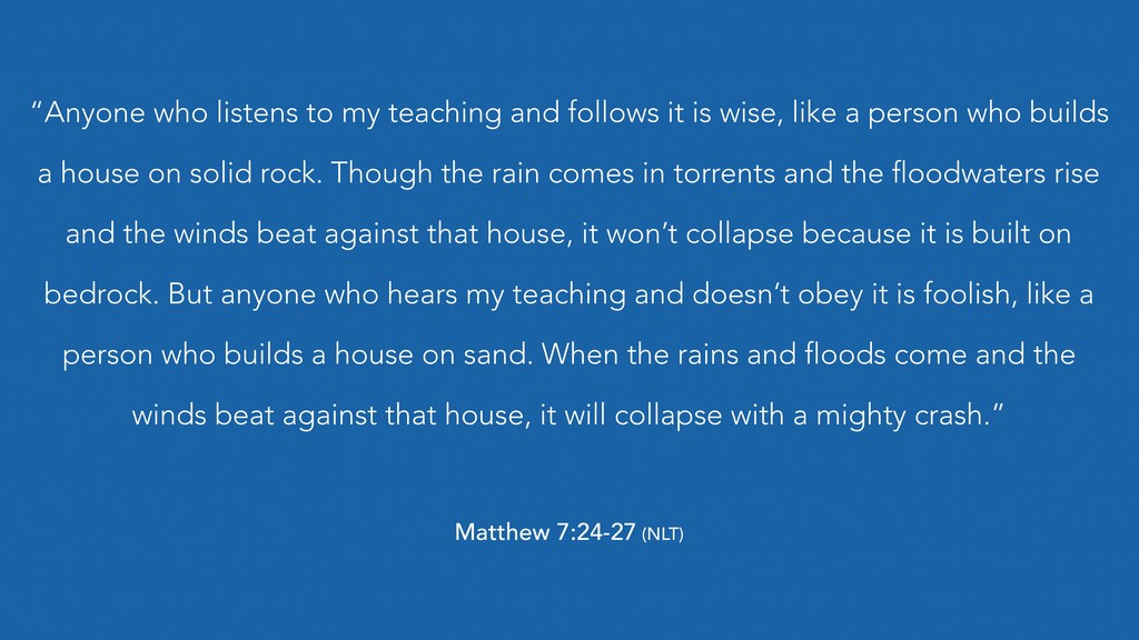 wise, like a person who builds a house on solid rock. Though the rain comes in torrents and the floodwaters rise and the winds beat against that house, it won’t collapse because it is built on bedrock. But anyone who hears my teaching and doesn’t obey it is foolish, like a person who builds a house on sand. When the rains and floods come and the winds beat against that house, it will collapse with a mighty crash.” Matthew 7:24-27 (NLT)