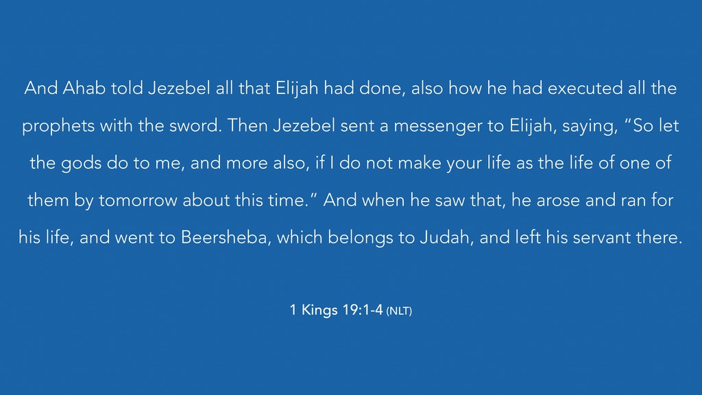 suddenly an angel touched him, and said to him, “Arise and eat.” Then he looked, and there by his head was a cake baked on coals, and a jar of water. So he ate and drank, and lay down again. And the angel of the Lord came back the second time, and touched him, and said, “Arise and eat, because the journey is too great for you.” So he arose, and ate and drank; and he went in the strength of that food forty days and forty nights as far as Horeb, the mountain of God. 1 Kings 19:5-9 (NLT)
