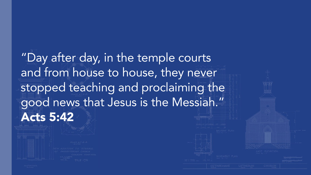 to house, they never stopped teaching and proclaiming the good news that Jesus is the Messiah.” Acts 5:42