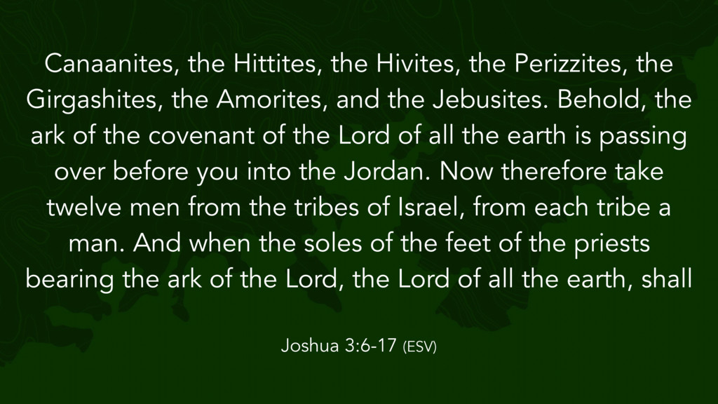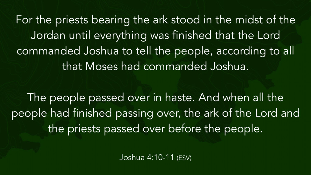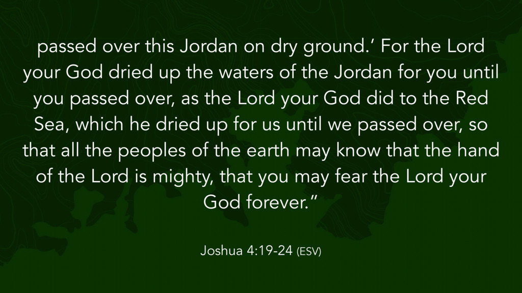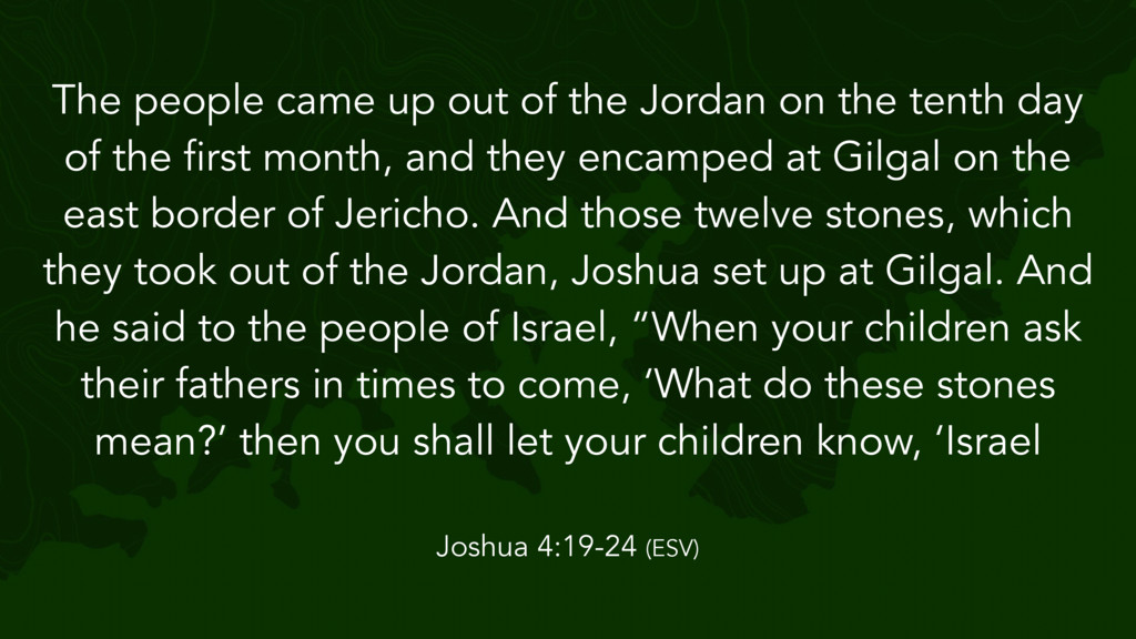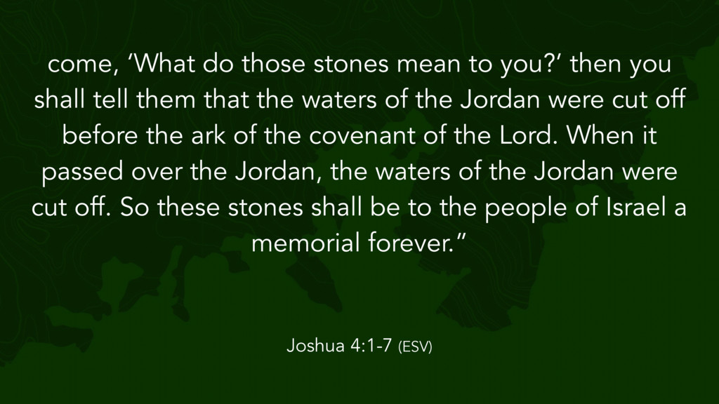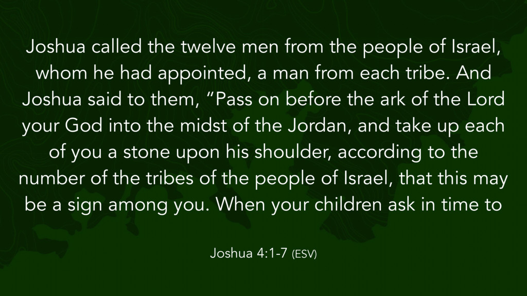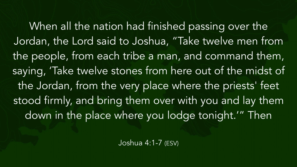 the Lord said to Joshua, “Take twelve men from the people, from each tribe a man, and command them, saying, ‘Take twelve stones from here out of the midst of the Jordan, from the very place where the priests' feet stood firmly, and bring them over with you and lay them down in the place where you lodge tonight.’” Then Joshua 4:1-7 (ESV)