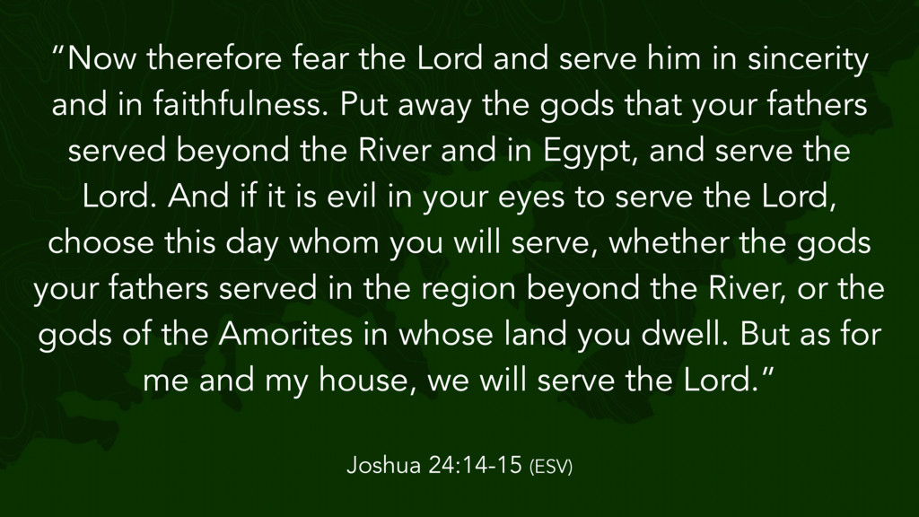 and in faithfulness. Put away the gods that your fathers served beyond the River and in Egypt, and serve the Lord. And if it is evil in your eyes to serve the Lord, choose this day whom you will serve, whether the gods your fathers served in the region beyond the River, or the gods of the Amorites in whose land you dwell. But as for me and my house, we will serve the Lord.” Joshua 24:14-15 (ESV)