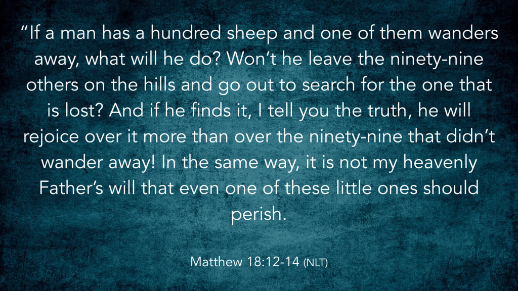 them wanders away, what will he do? Won’t he leave the ninety-nine others on the hills and go out to search for the one that is lost? And if he finds it, I tell you the truth, he will rejoice over it more than over the ninety-nine that didn’t wander away! In the same way, it is not my heavenly Father’s will that even one of these little ones should perish. Matthew 18:12-14 (NLT)