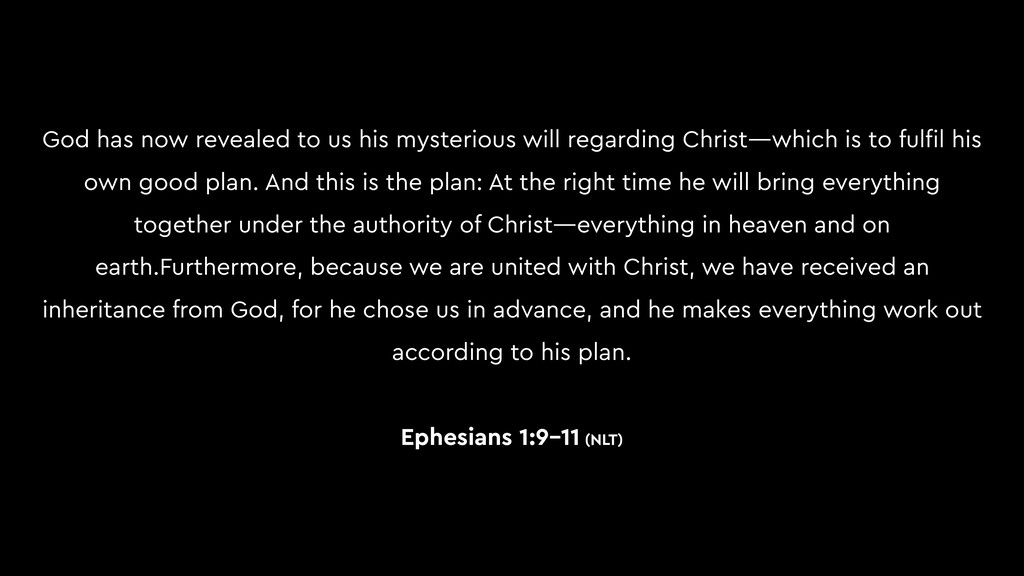 Christ—which is to fulfil his own good plan. And this is the plan: At the right time he will bring everything together under the authority of Christ—everything in heaven and on earth.Furthermore, because we are united with Christ, we have received an inheritance from God, for he chose us in advance, and he makes everything work out according to his plan. Ephesians 1:9–11 (NLT)