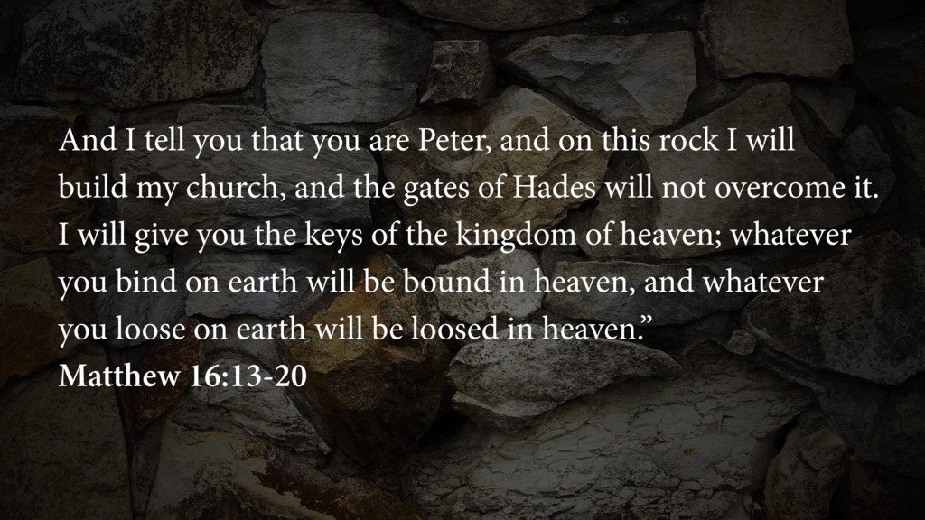 this rock I will build my church, and the gates of Hades will not overcome it. I will give you the keys of the kingdom of heaven; whatever you bind on earth will be bound in heaven, and whatever you loose on earth will be loosed in heaven.” Matthew 16:13-20