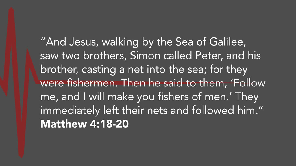 brothers, Simon called Peter, and his brother, casting a net into the sea; for they were fishermen. Then he said to them, ‘Follow me, and I will make you fishers of men.’ They immediately left their nets and followed him.” Matthew 4:18-20