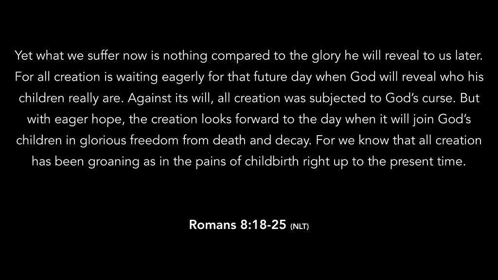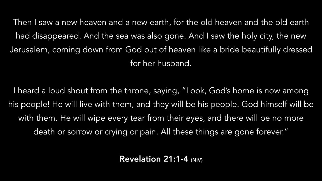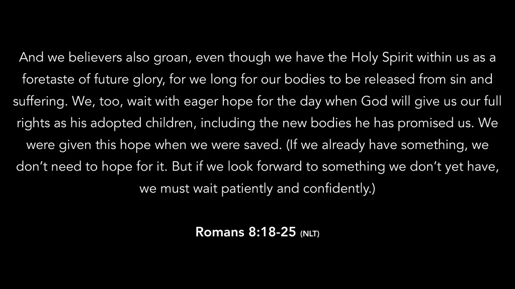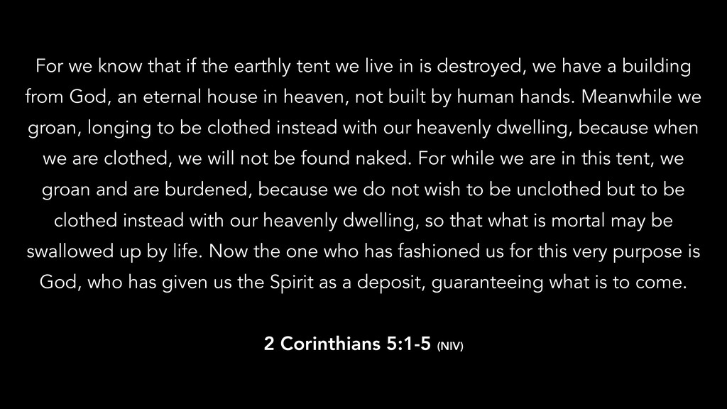 in is destroyed, we have a building from God, an eternal house in heaven, not built by human hands. Meanwhile we groan, longing to be clothed instead with our heavenly dwelling, because when we are clothed, we will not be found naked. For while we are in this tent, we groan and are burdened, because we do not wish to be unclothed but to be clothed instead with our heavenly dwelling, so that what is mortal may be swallowed up by life. Now the one who has fashioned us for this very purpose is God, who has given us the Spirit as a deposit, guaranteeing what is to come. 2 Corinthians 5:1-5 (NIV)