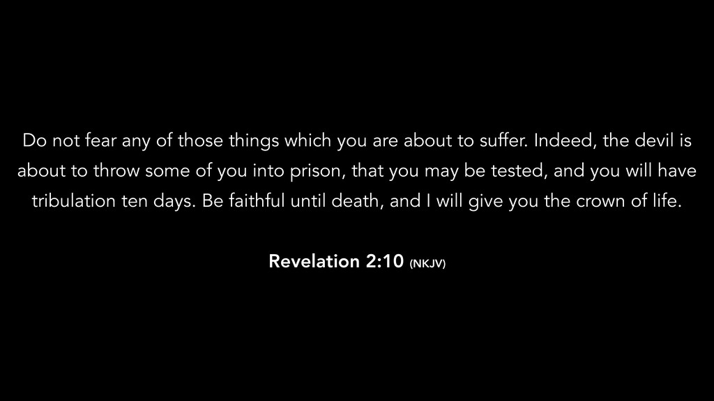 about to suffer. Indeed, the devil is about to throw some of you into prison, that you may be tested, and you will have tribulation ten days. Be faithful until death, and I will give you the crown of life. Revelation 2:10 (NKJV)