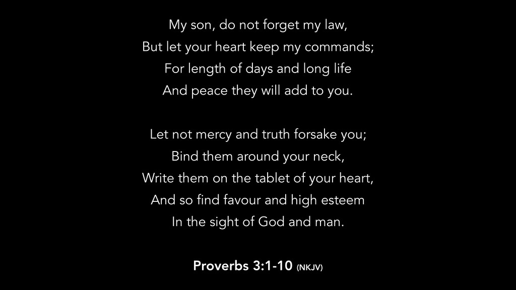 heart keep my commands; For length of days and long life And peace they will add to you. Let not mercy and truth forsake you; Bind them around your neck, Write them on the tablet of your heart, And so find favour and high esteem In the sight of God and man. Proverbs 3:1-10 (NKJV)