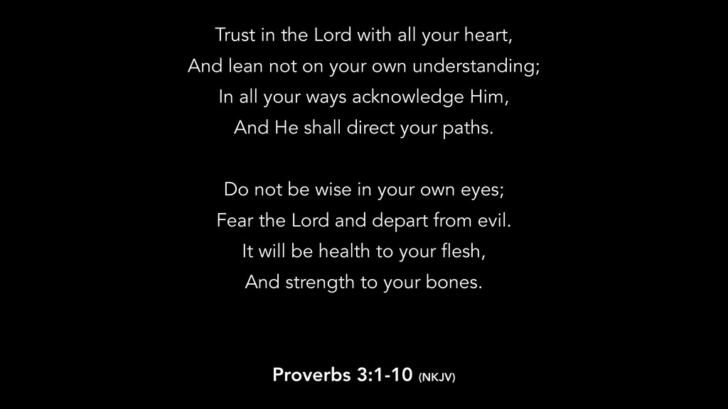 not on your own understanding; In all your ways acknowledge Him, And He shall direct your paths. Do not be wise in your own eyes; Fear the Lord and depart from evil. It will be health to your flesh, And strength to your bones. Proverbs 3:1-10 (NKJV)