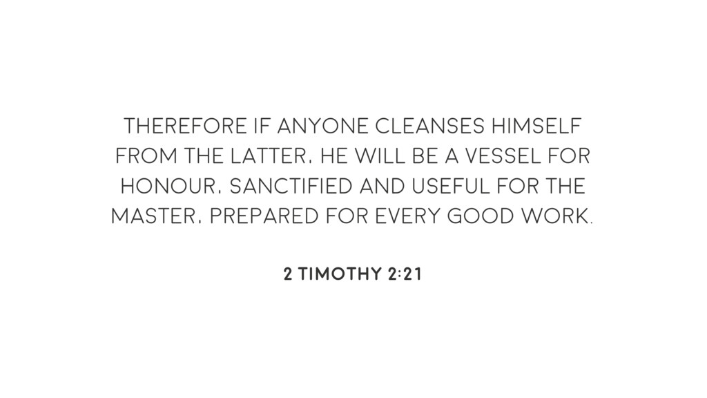 be a vessel for honour, sanctified and useful for the Master, prepared for every good work. 2 timothy 2:21