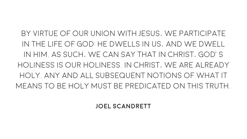 the life of God: He dwells in us, and we dwell in him. As such, we can say that in Christ, God’s holiness is our holiness. In Christ, we are already holy. Any and all subsequent notions of what it means to be holy must be predicated on this truth. joel scandrett