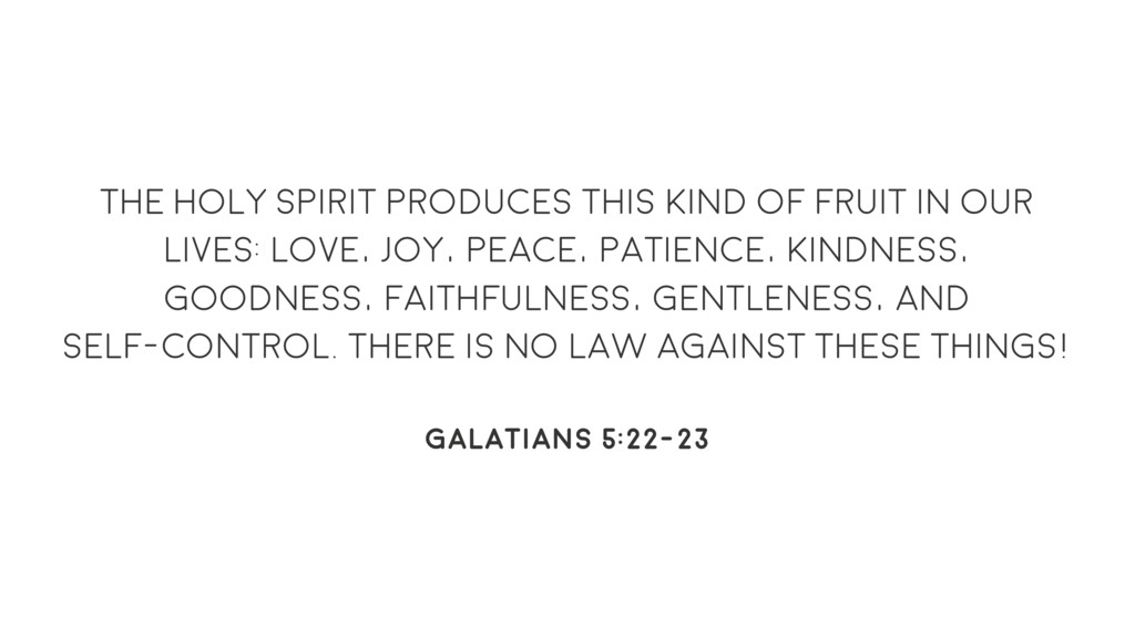lives: love, joy, peace, patience, kindness, goodness, faithfulness, gentleness, and self-control. There is no law against these things! galatians 5:22-23