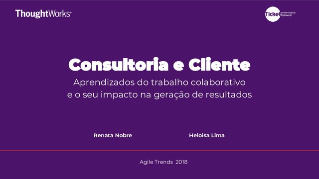 Mais do que metodologias e ferramentas, a boa relação e comunicação efetiva entre Consultoria e Cliente são a base para provocar a motivação e o engajamento dos times com foco em objetivos claros e alinhados. ThoughtWorks e Ticket compartilham os principais desafios e aprendizados no seu trabalho colaborativo – primordiais para o