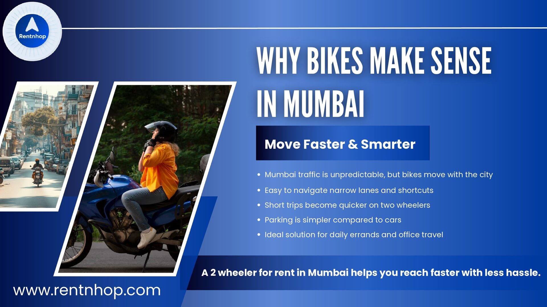 but bikes move with the city Easy to navigate narrow lanes and shortcuts Short trips become quicker on two wheelers Parking is simpler compared to cars Ideal solution for daily errands and office travel Move Faster & Smarter A 2 wheeler for rent in Mumbai helps you reach faster with less hassle. www.rentnhop.com