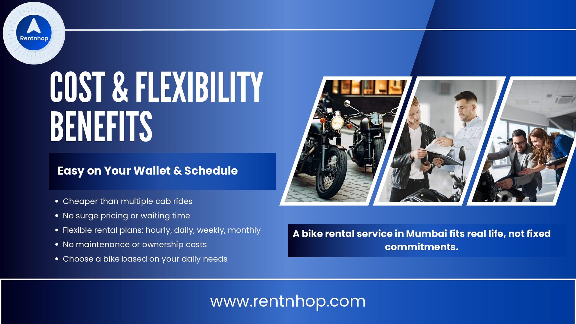 surge pricing or waiting time Flexible rental plans: hourly, daily, weekly, monthly No maintenance or ownership costs Choose a bike based on your daily needs www.rentnhop.com Easy on Your Wallet & Schedule A bike rental service in Mumbai fits real life, not fixed commitments.