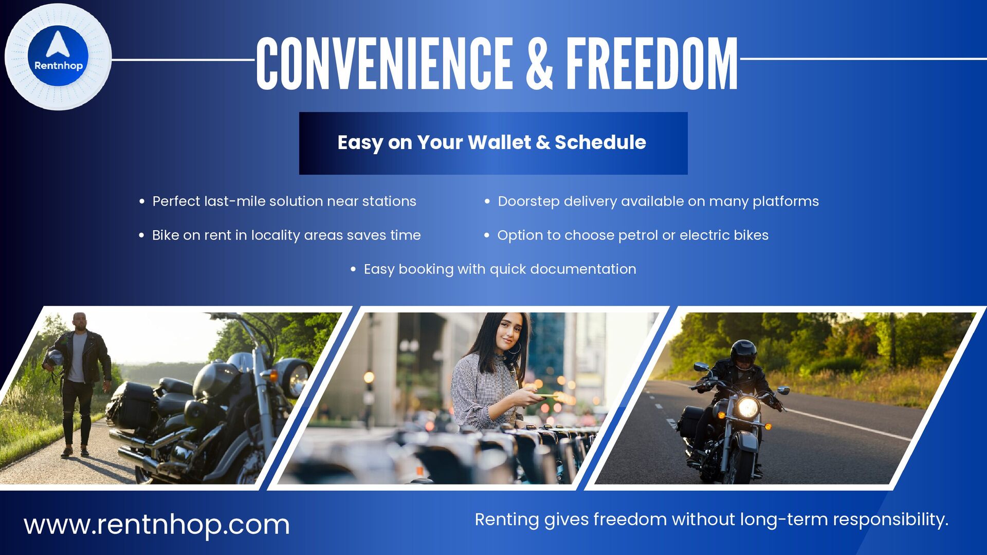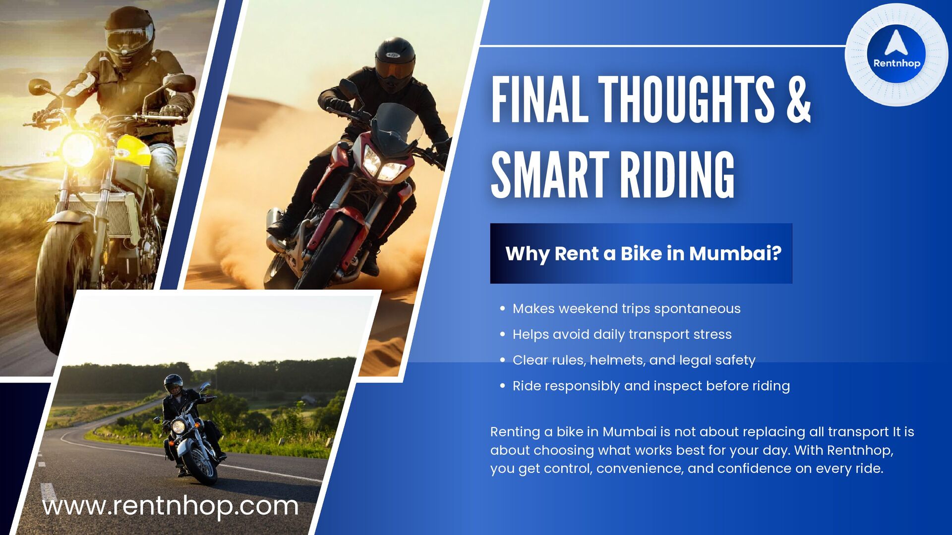 avoid daily transport stress Clear rules, helmets, and legal safety Ride responsibly and inspect before riding Why Rent a Bike in Mumbai? Renting a bike in Mumbai is not about replacing all transport It is about choosing what works best for your day. With Rentnhop, you get control, convenience, and confidence on every ride. www.rentnhop.com