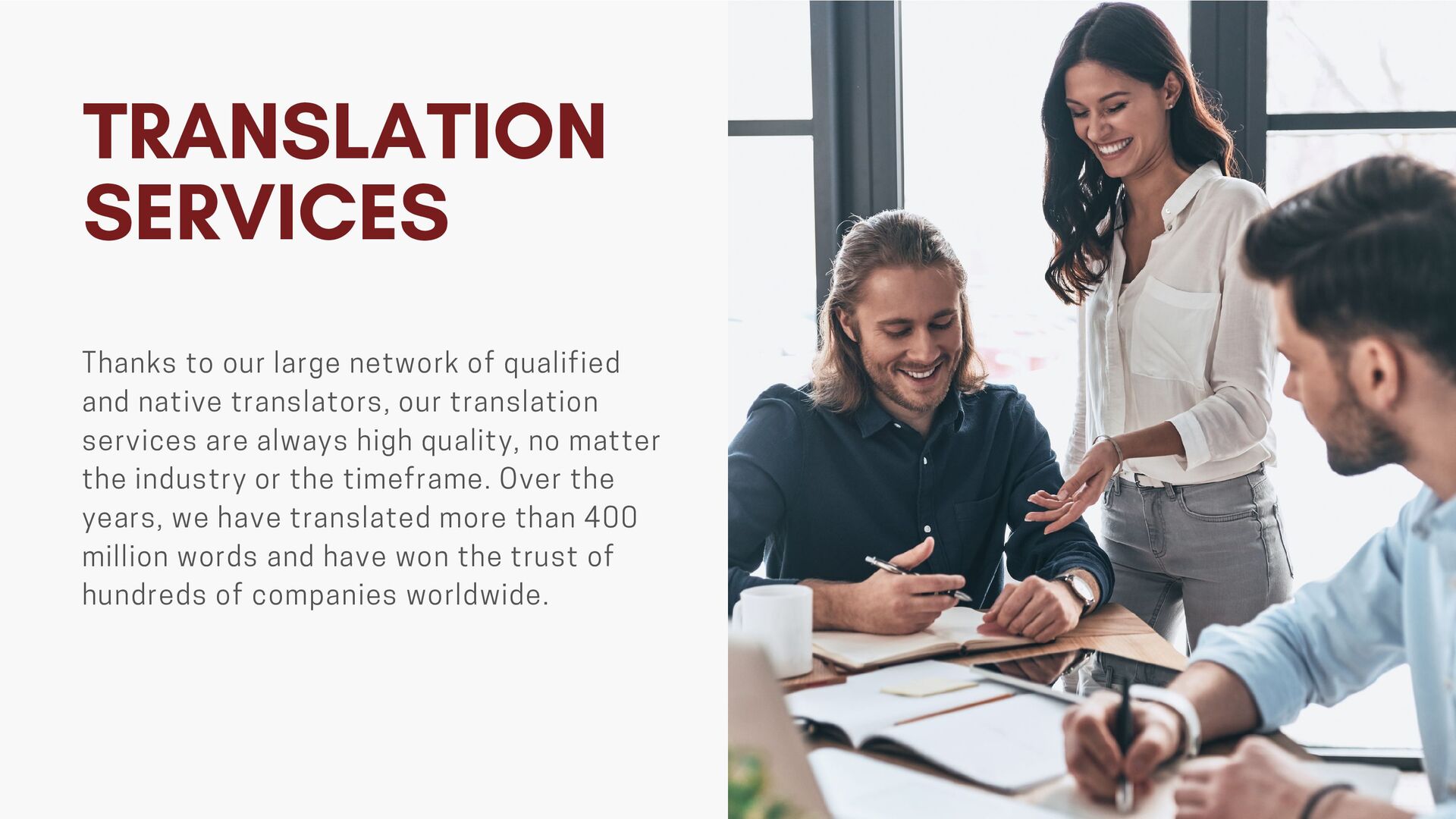 Thanks to our large network of qualified translators, our translation services are always high quality, no matter the industry. Over the years, we have translated more than 400 million words and have won the trust of hundreds of companies locally and globally. Join them and let us help you with your translation services needs today.