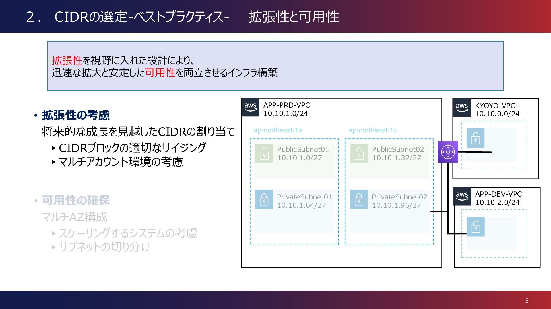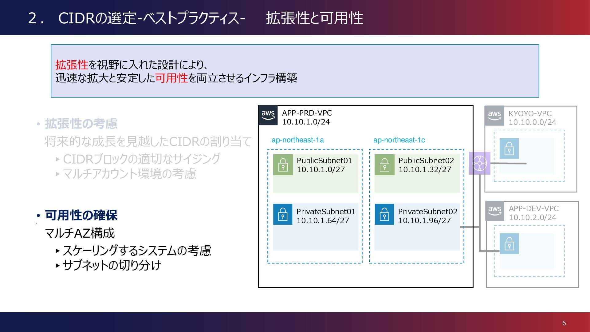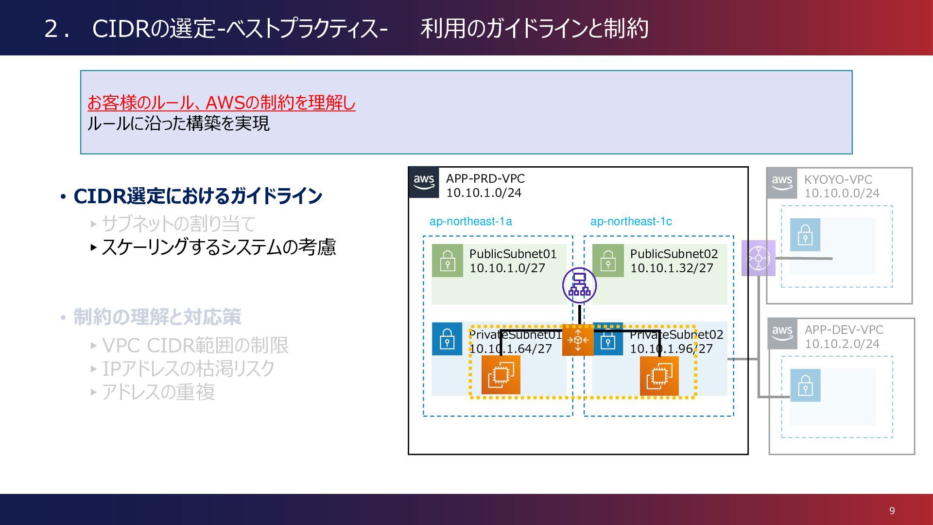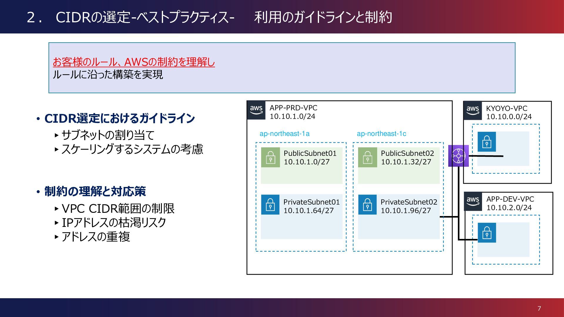 APP-DEV-VPC 10.10.2.0/24 KYOYO-VPC 10.10.0.0/24 PublicSubnet02 10.10.1.32/27 PrivateSubnet02 10.10.1.96/27 ap-northeast-1c APP-PRD-VPC 10.10.1.0/24 2. CIDRの選定-ベストプラクティス- 利用のガイドラインと制約 • CIDR選定におけるガイドライン ▸サブネットの割り当て ▸スケーリングするシステムの考慮 • 制約の理解と対応策 ▸VPC CIDR範囲の制限 ▸IPアドレスの枯渇リスク ▸アドレスの重複 お客様のルール、AWSの制約を理解し ルールに沿った構築を実現 CIDRの下限・上限 /16 ~ /28(65,536~16) 複数のIPを使用 ECS/EKS ALB (Endpoint) IPアドレスの重複 オンプレ環境や企業合併など