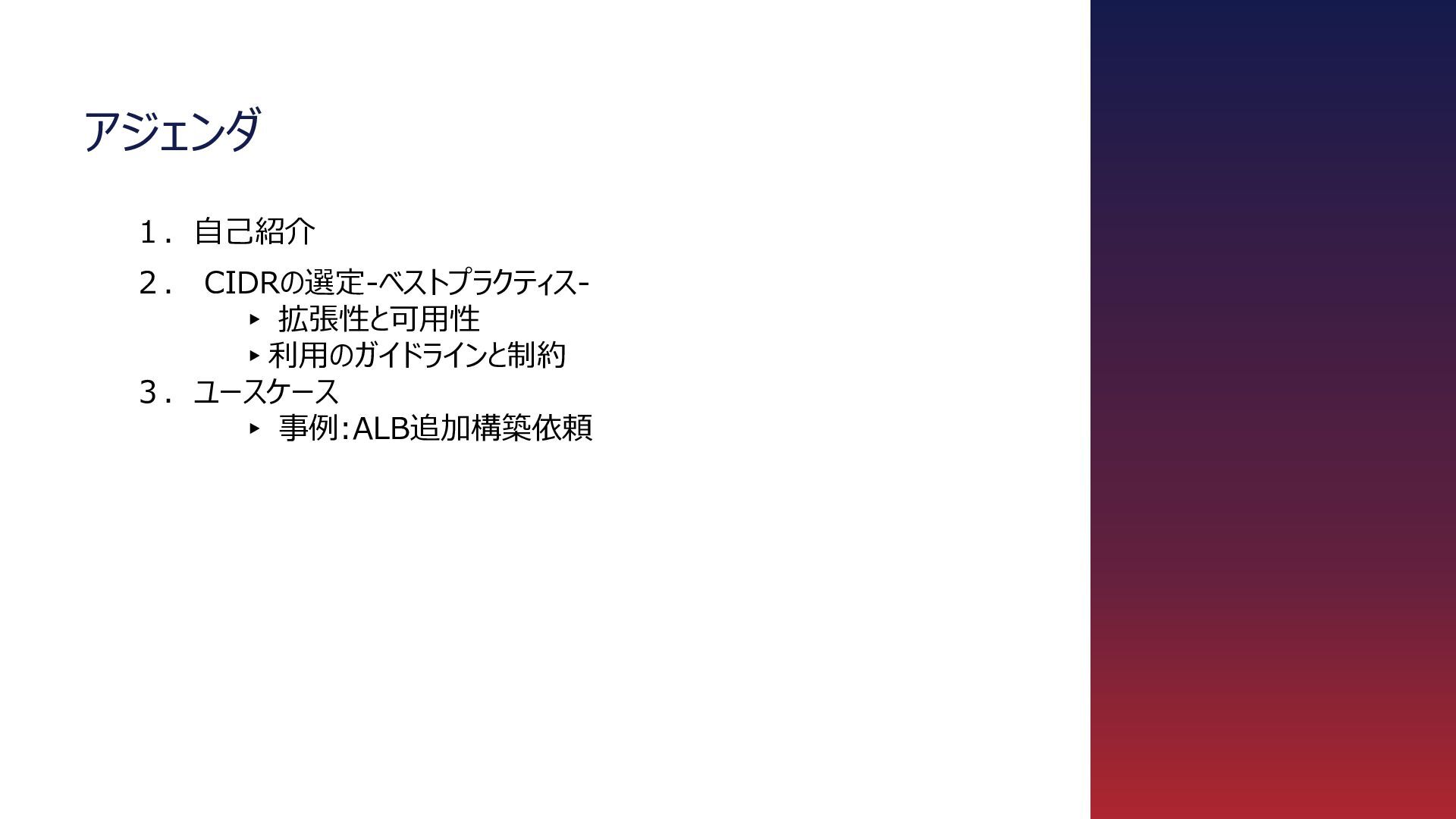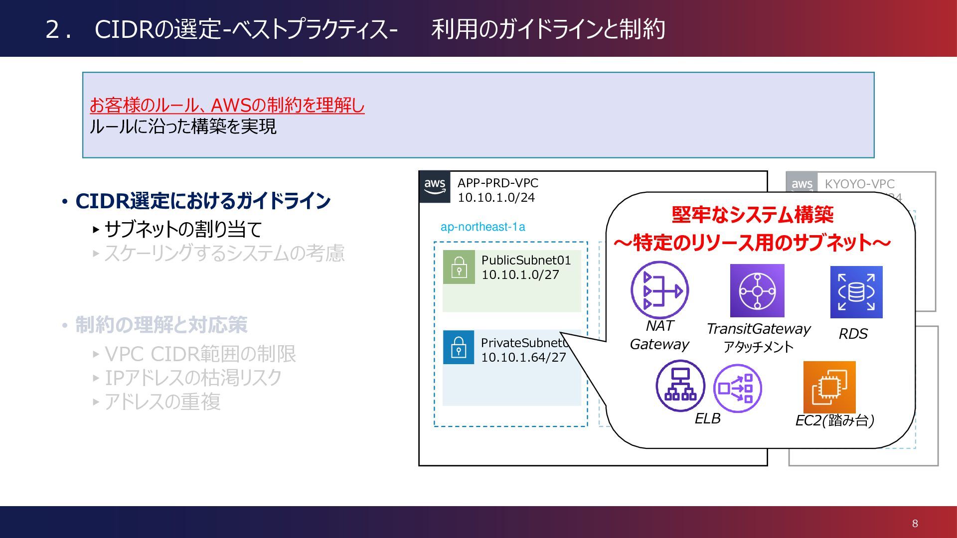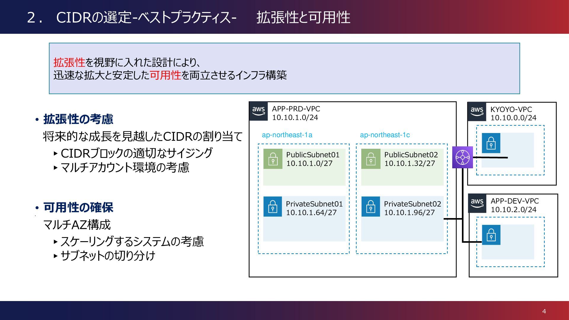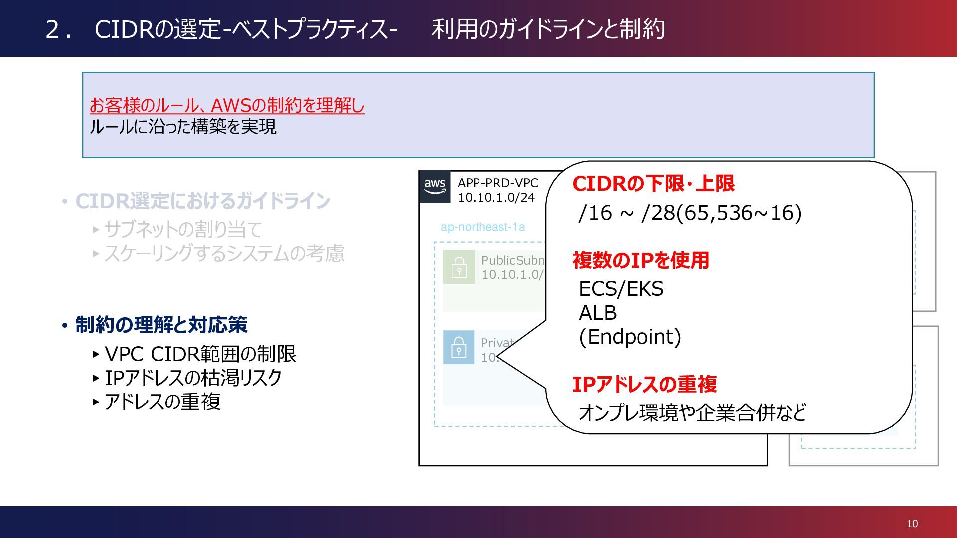 APP-DEV-VPC 10.10.2.0/24 KYOYO-VPC 10.10.0.0/24 PublicSubnet02 10.10.1.32/27 PrivateSubnet02 10.10.1.96/27 ap-northeast-1c APP-PRD-VPC 10.10.1.0/24 2. CIDRの選定-ベストプラクティス- 利用のガイドラインと制約 • CIDR選定におけるガイドライン ▸サブネットの割り当て ▸スケーリングするシステムの考慮 • 制約の理解と対応策 ▸VPC CIDR範囲の制限 ▸IPアドレスの枯渇リスク ▸アドレスの重複 お客様のルール、AWSの制約を理解し ルールに沿った構築を実現 CIDRの下限・上限 /16 ~ /28(65,536~16) 複数のIPを使用 ECS/EKS ALB (Endpoint) IPアドレスの重複 オンプレ環境や企業合併など