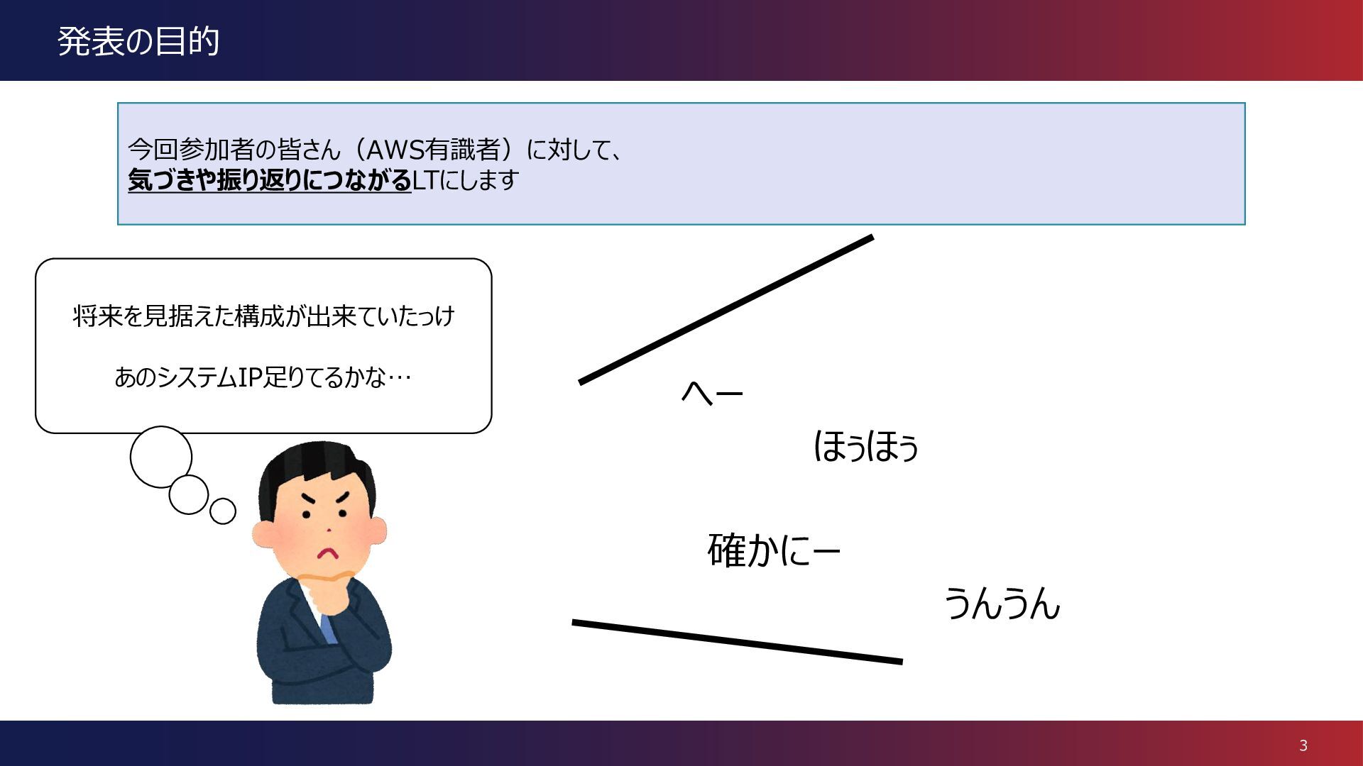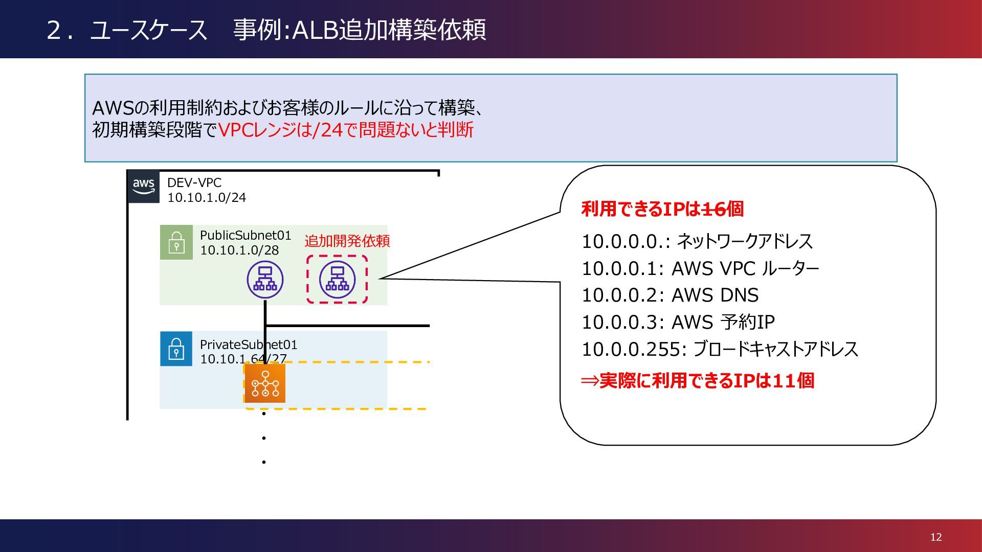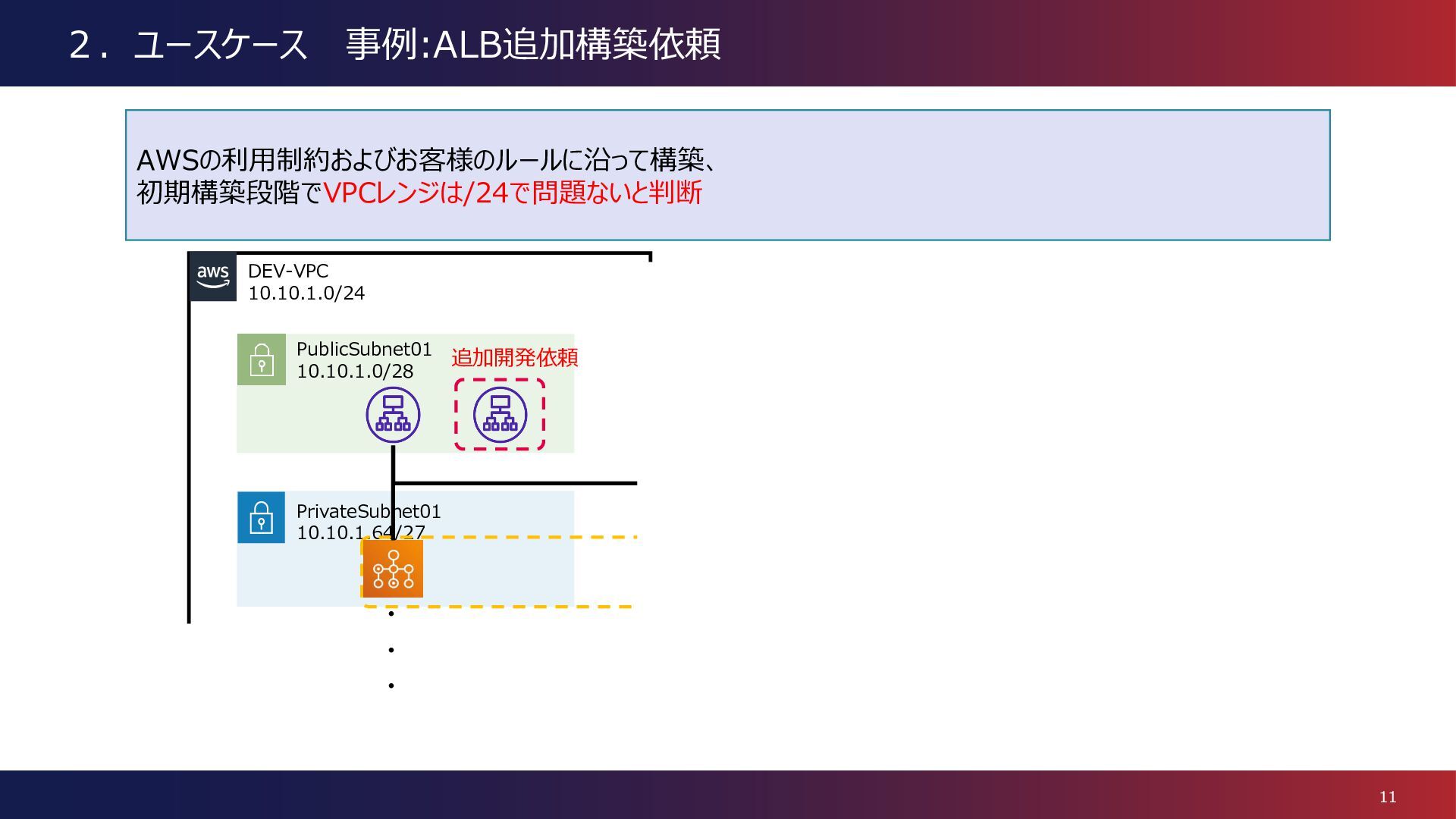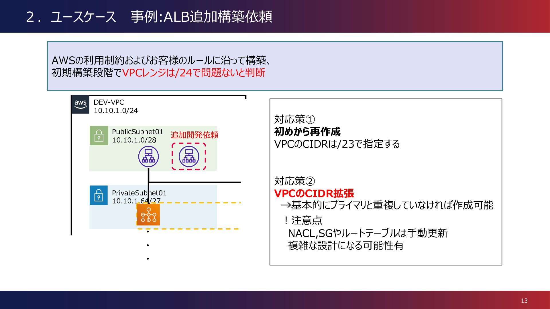 APP-DEV-VPC 10.10.2.0/24 KYOYO-VPC 10.10.0.0/24 PublicSubnet02 10.10.1.32/27 PrivateSubnet02 10.10.1.96/27 ap-northeast-1c APP-PRD-VPC 10.10.1.0/24 2. CIDRの選定-ベストプラクティス- 利用のガイドラインと制約 • CIDR選定におけるガイドライン ▸サブネットの割り当て ▸スケーリングするシステムの考慮 • 制約の理解と対応策 ▸VPC CIDR範囲の制限 ▸IPアドレスの枯渇リスク ▸アドレスの重複 お客様のルール、AWSの制約を理解し ルールに沿った構築を実現 CIDRの下限・上限 /16 ~ /28(65,536~16) 複数のIPを使用 ECS/EKS ALB (Endpoint) IPアドレスの重複 オンプレ環境や企業合併など