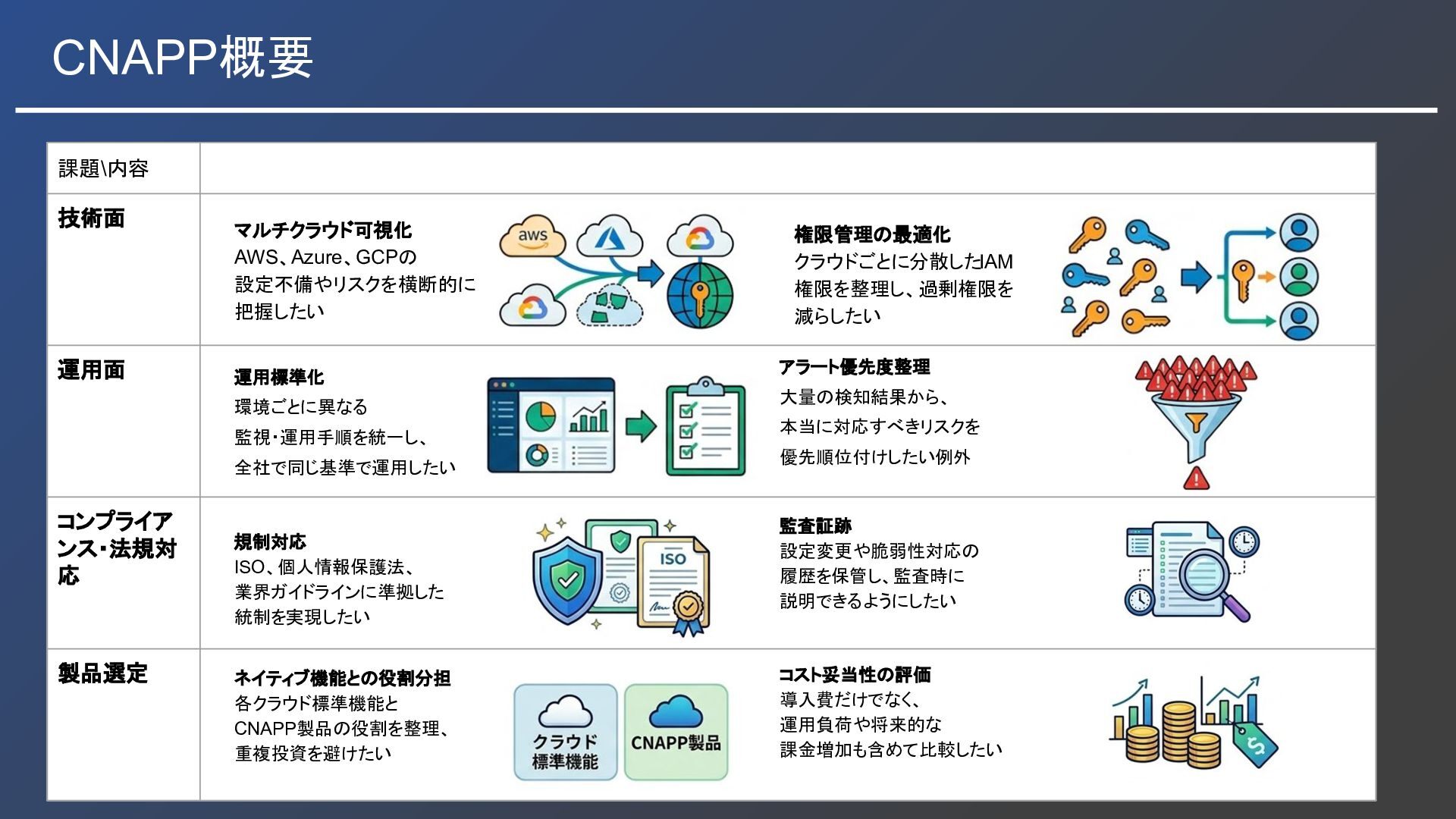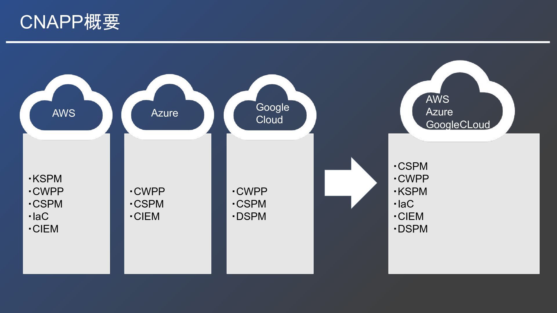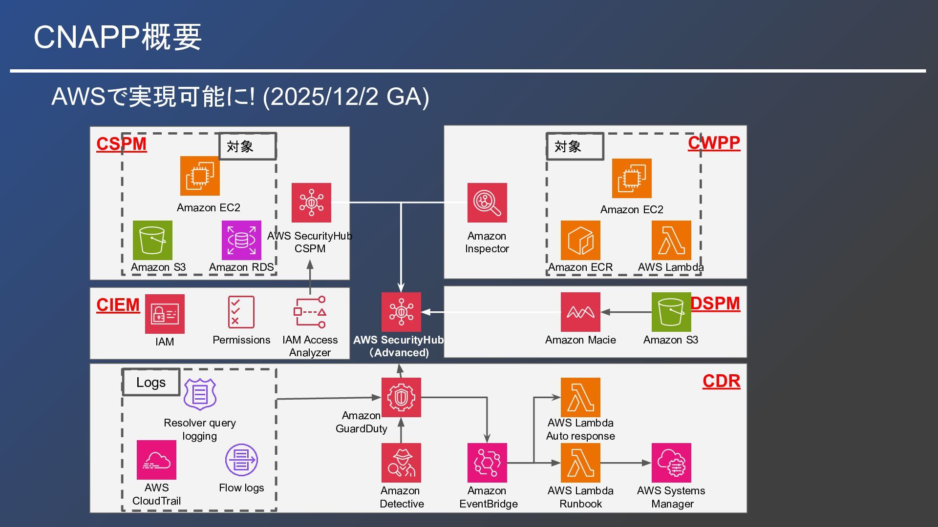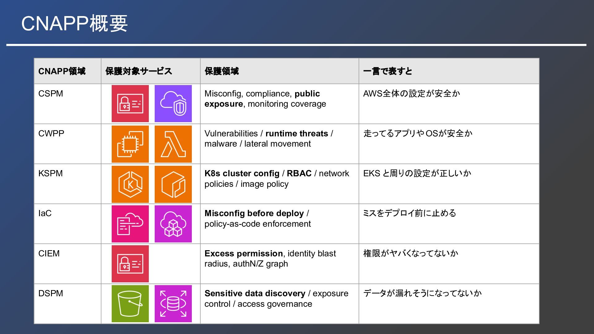 monitoring coverage AWS全体の設定が安全か CWPP Vulnerabilities / runtime threats / malware / lateral movement 走ってるアプリやOSが安全か KSPM K8s cluster config / RBAC / network policies / image policy EKS と周りの設定が正しいか IaC Misconfig before deploy / policy-as-code enforcement ミスをデプロイ前に止める CIEM Excess permission, identity blast radius, authN/Z graph 権限がヤバくなってないか DSPM Sensitive data discovery / exposure control / access governance データが漏れそうになってないか