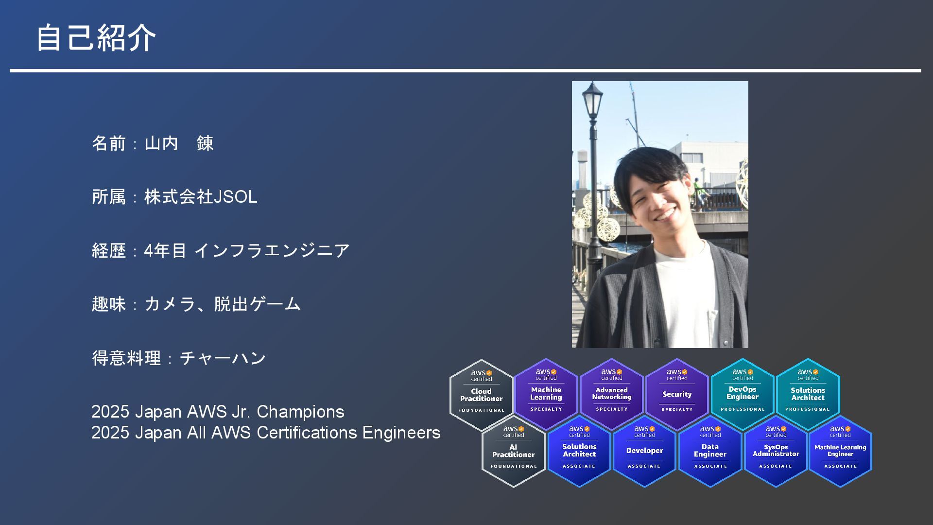 自己紹介 名前:山内 錬 所属:株式会社JSOL 経歴:4年目 インフラエンジニア 趣味:カメラ、脱出ゲーム 得意料理:チャーハン 2025 Japan