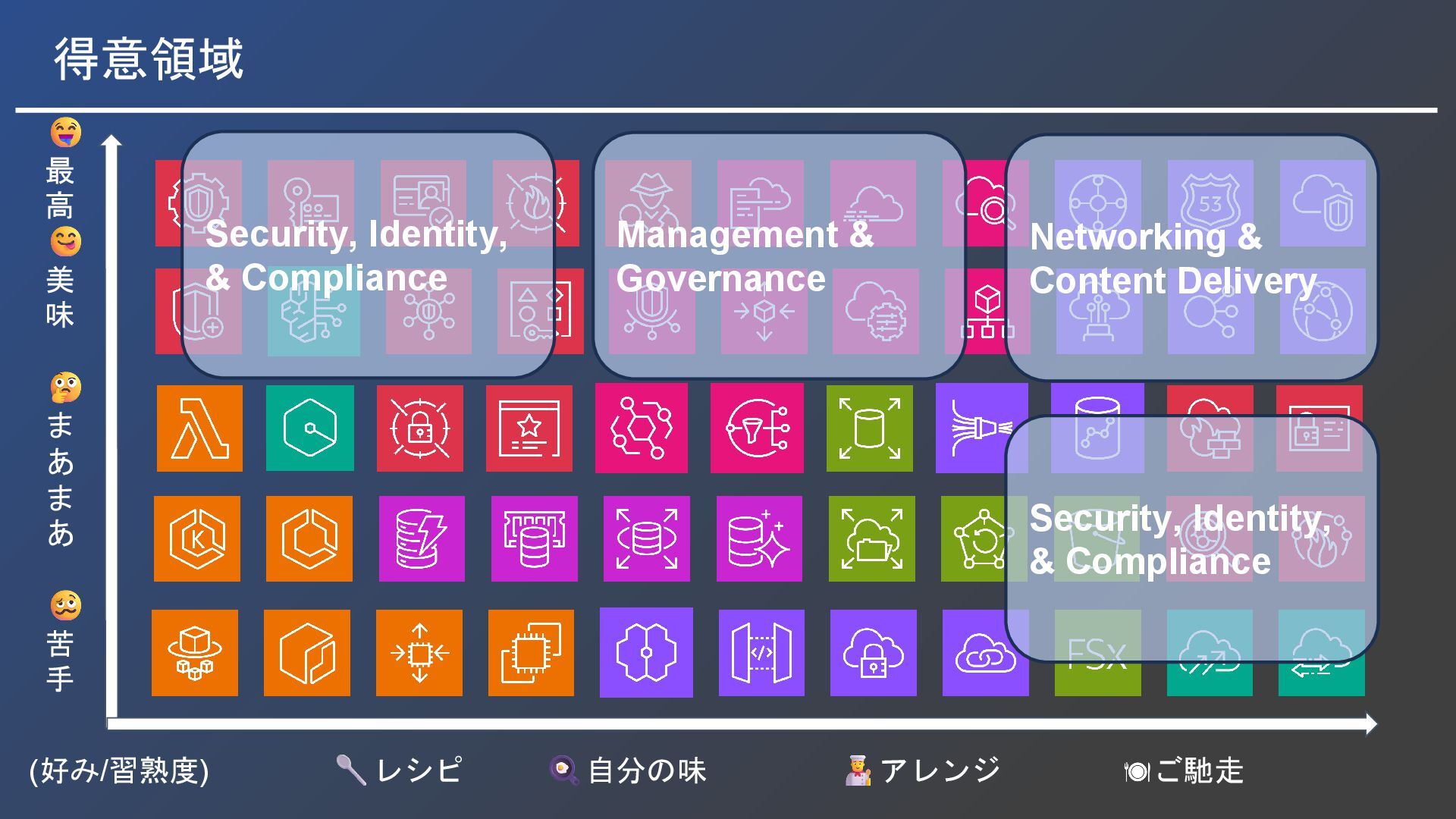 手 (好み/習熟度) レシピ 自分の味 アレンジ ご馳走 Security, Identity, & Compliance Management & Governance Networking & Content Delivery Security, Identity, & Compliance