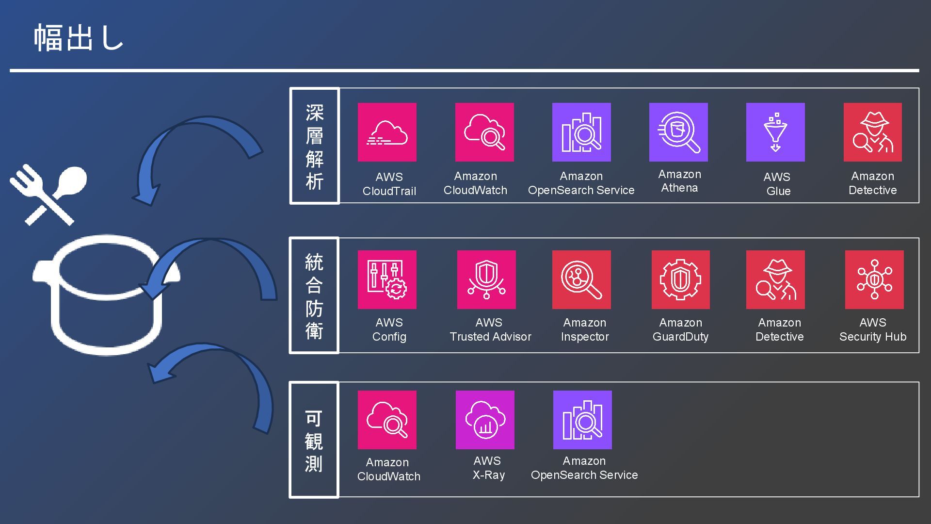AWS Glue Amazon Detective AWS Config AWS Security Hub Amazon Inspector AWS Trusted Advisor Amazon Detective Amazon GuardDuty Amazon CloudWatch AWS X-Ray Amazon OpenSearch Service 深 層 解 析 統 合 防 衛 可 観 測