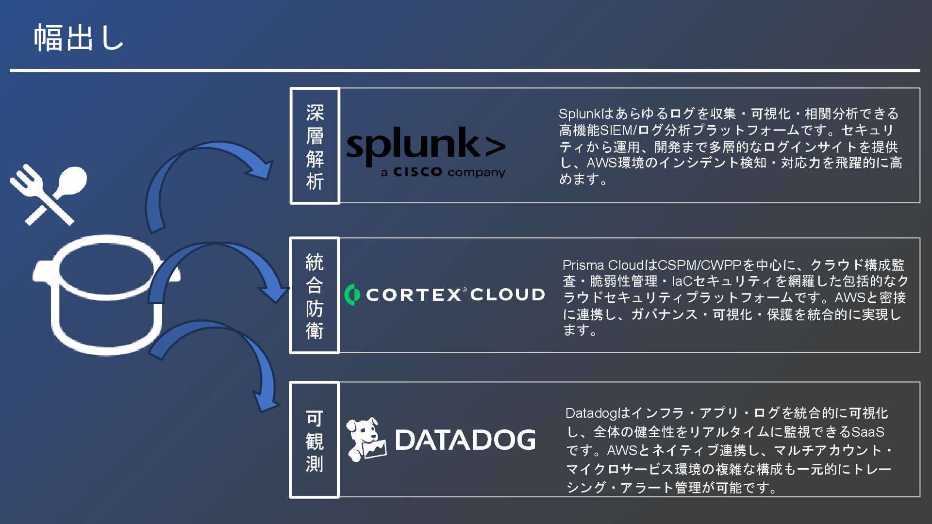 幅出し Datadogはインフラ・アプリ・ログを統合的に可視化 し、全体の健全性をリアルタイムに監視できるSaaS です。AWSとネイティブ連携し、マルチアカウント・ マイクロサービス環境の複雑な構成も一元的にトレー シング・アラート管理が可能です。 Splunkはあらゆるログを収集・可視化・相関分析できる 高機能SIEM/ログ分析プラットフォームです。セキュリ ティから運用、開発まで多層的なログインサイトを提供 し、AWS環境のインシデント検知・対応力を飛躍的に高