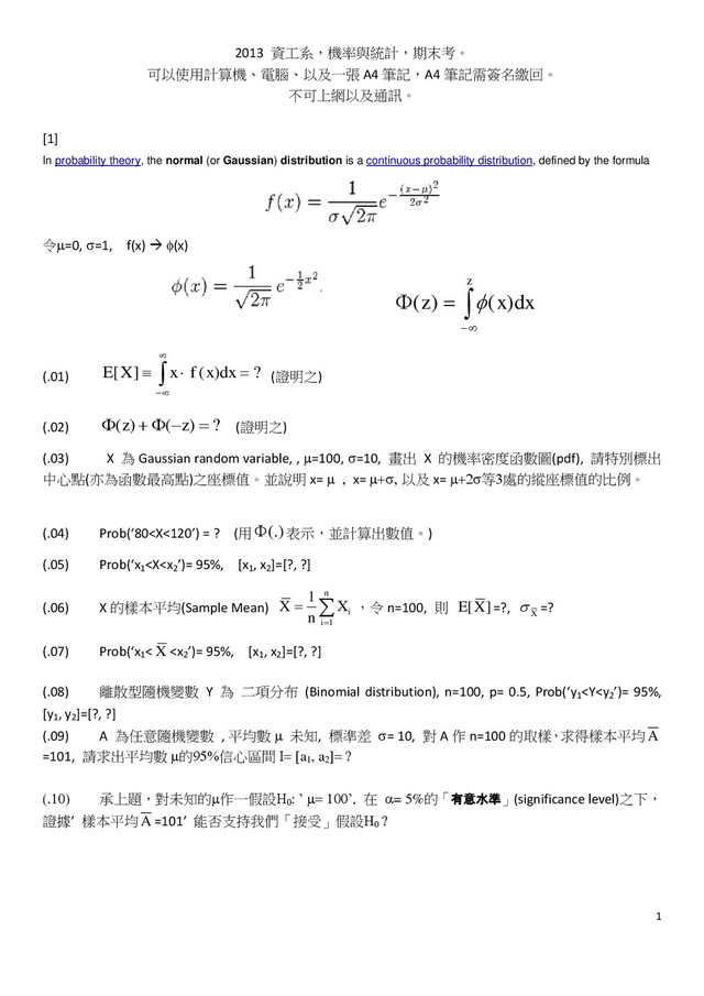 probability theory, the normal (or Gaussian) distribution is a continuous probability distribution, defined by the formula 令=0, =1, f(x) (x) z dx x z ) ( ) ( (.01) ? ) ( ] [ dx x f x X E (證明之) (.02) ? ) ( ) ( z z (證明之) (.03) X 為 Gaussian random variable, ,=100, =10, 畫出 X 的機率密度函數圖(pdf), 請特別標出 中心點(亦為函數最高點)之座標值。並說明 x=x=以及 x=等處的縱座標值的比例。 (.04) Prob(‘80<X<120’) = ? (用 (.) 表示,並計算出數值。) (.05) Prob(‘x1 <X<x2 ’)= 95%, [x1 , x2 ]=[?, ?] (.06) X 的樣本平均(Sample Mean) n i i X n X 1 1 ,令 n=100, 則 ] [X E =?, X =? (.07) Prob(‘x1 < X <x2 ’)= 95%, [x1 , x2 ]=[?, ?] (.08) 離散型隨機變數 Y 為 二項分布 (Binomial distribution), n=100, p= 0.5, Prob(‘y1 <Y<y2 ’)= 95%, [y1 , y2 ]=[?, ?] (.09) A 為任意隨機變數 ,平均數 未知, 標準差 = 10, 對 A 作 n=100 的取樣,求得樣本平均 A =101, 請求出平均數的信心區間a1 , a2 承上題,對未知的作一假設 : ’’, 在 = 5%的「有意水準」(significance level)之下, 證據’ 樣本平均 A =101’ 能否支持我們「接受」假設