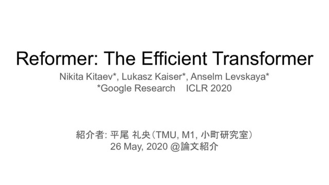 Reformer: The Efficient Transformer Nikita Kitaev*, Lukasz Kaiser*, Anselm Levskaya*