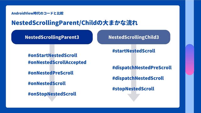 AndroidView時代のコードと比較 ネストスクロールをサポートするかどうか決める NestedScrollingParent3 NestedScrollingChild3 #startNestedScroll #onStartNestedScroll #onNestedScrollAccepted #dispatchNestedPreScroll #onNestedPreScroll #dispatchNestedScroll