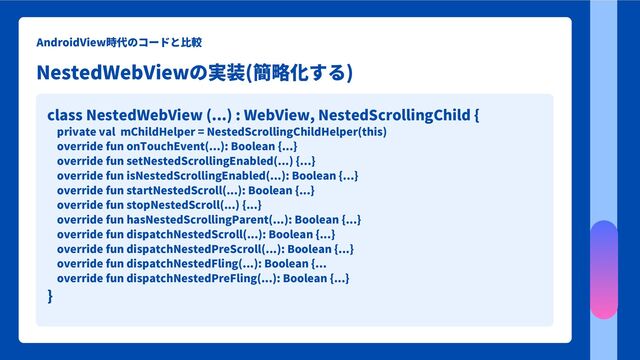 { private val mChildHelper = NestedScrollingChildHelper(this) override fun onTouchEvent(...): Boolean {...} override fun setNestedScrollingEnabled(...) {...} override fun isNestedScrollingEnabled(...): Boolean {...} override fun startNestedScroll(...): Boolean {...} override fun stopNestedScroll(...) {...} override fun hasNestedScrollingParent(...): Boolean {...} override fun dispatchNestedScroll(...): Boolean {...} override fun dispatchNestedPreScroll(...): Boolean {...} override fun dispatchNestedFling(...): Boolean {... override fun dispatchNestedPreFling(...): Boolean {...} }