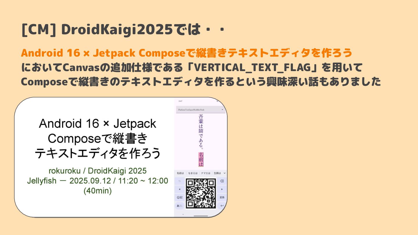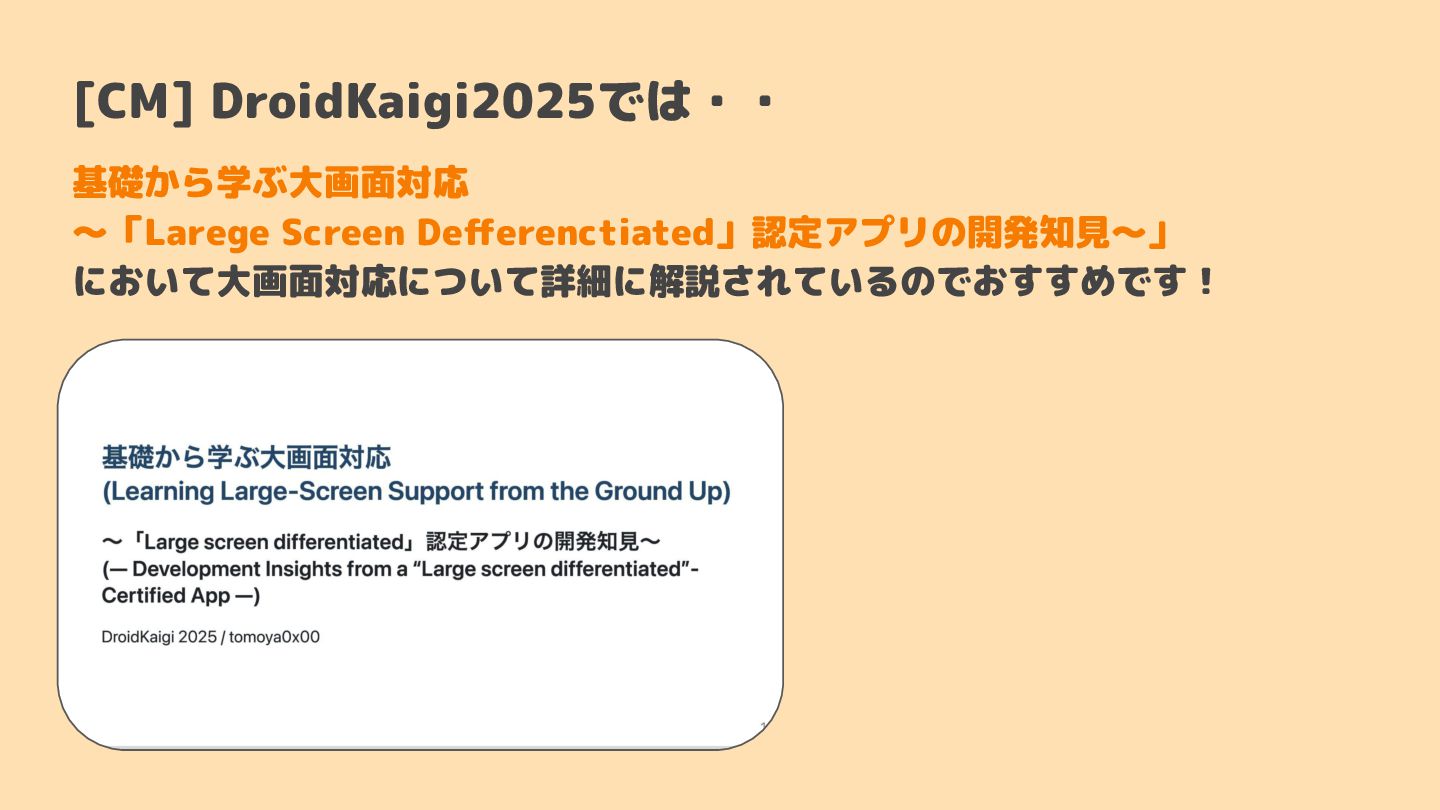 DroidKaigi 2025 後夜祭にて発表したスライドです。 https://docs.google.com/presentation/d/19D3GaDVV8MnB7PKVSVa7J0WgkzI5Ahl1JJ_kH_gC6Nk/edit?slide=id.p#slide=id.p