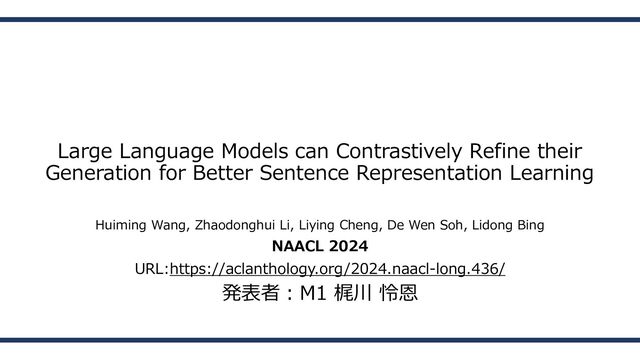 Sentence Representation Learning Huiming Wang, Zhaodonghui Li, Liying Cheng, De Wen Soh, Lidong Bing NAACL 2024 URL:https://aclanthology.org/2024.naacl-long.436/ 発表者:M1 梶川 怜恩