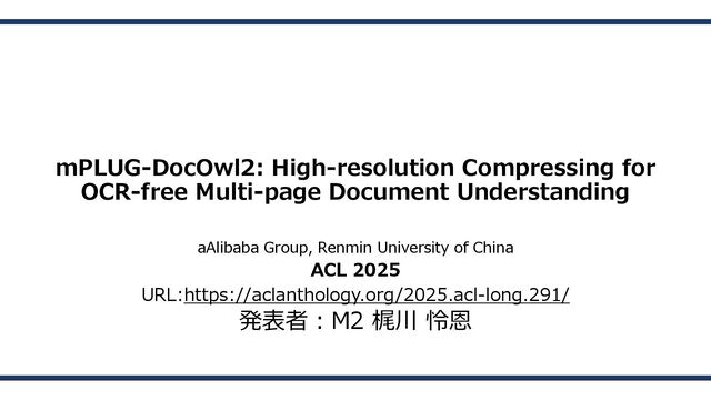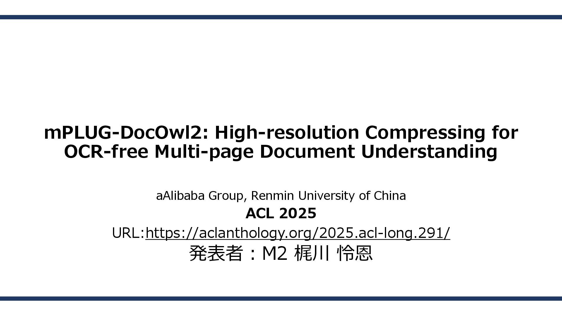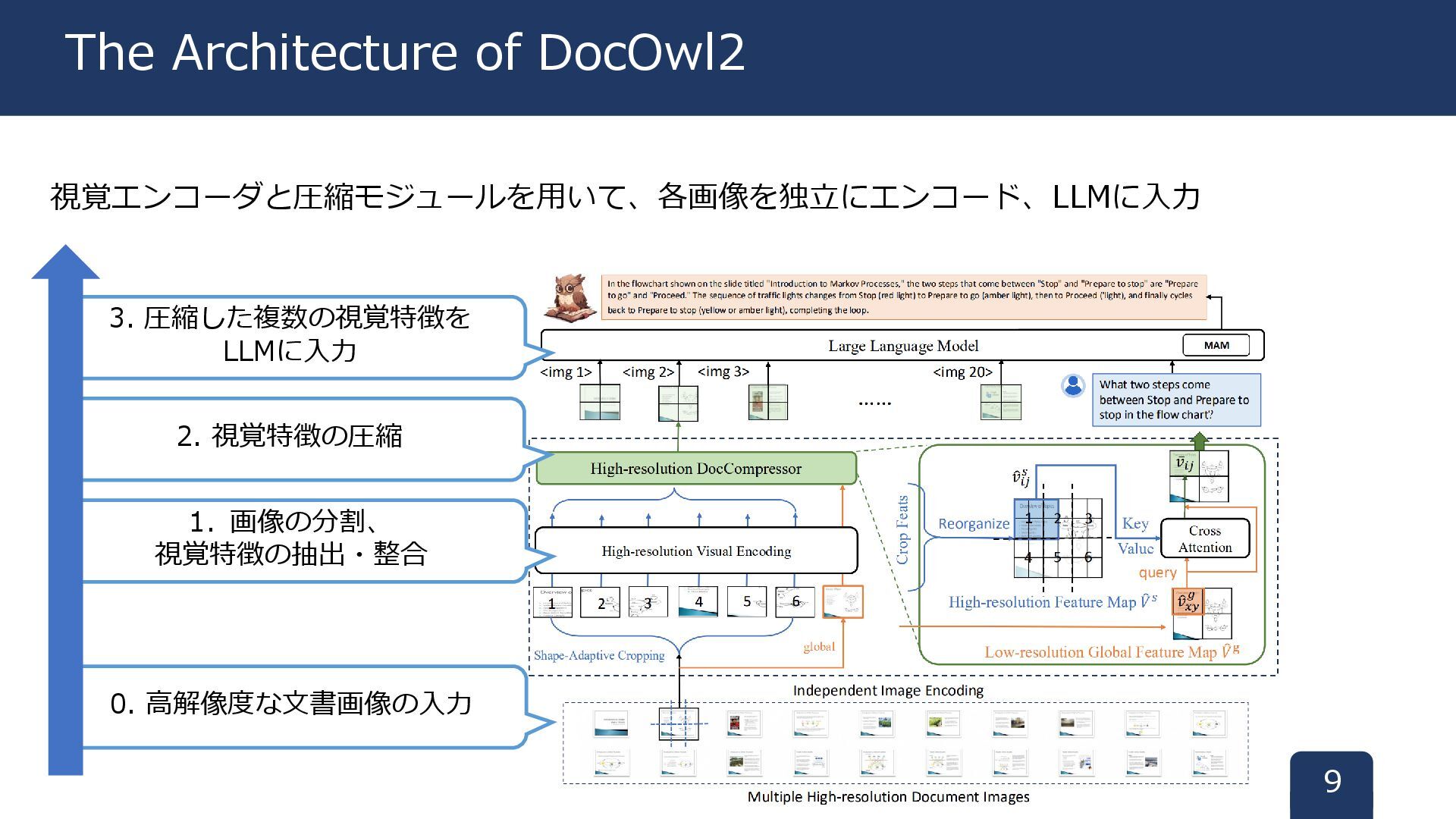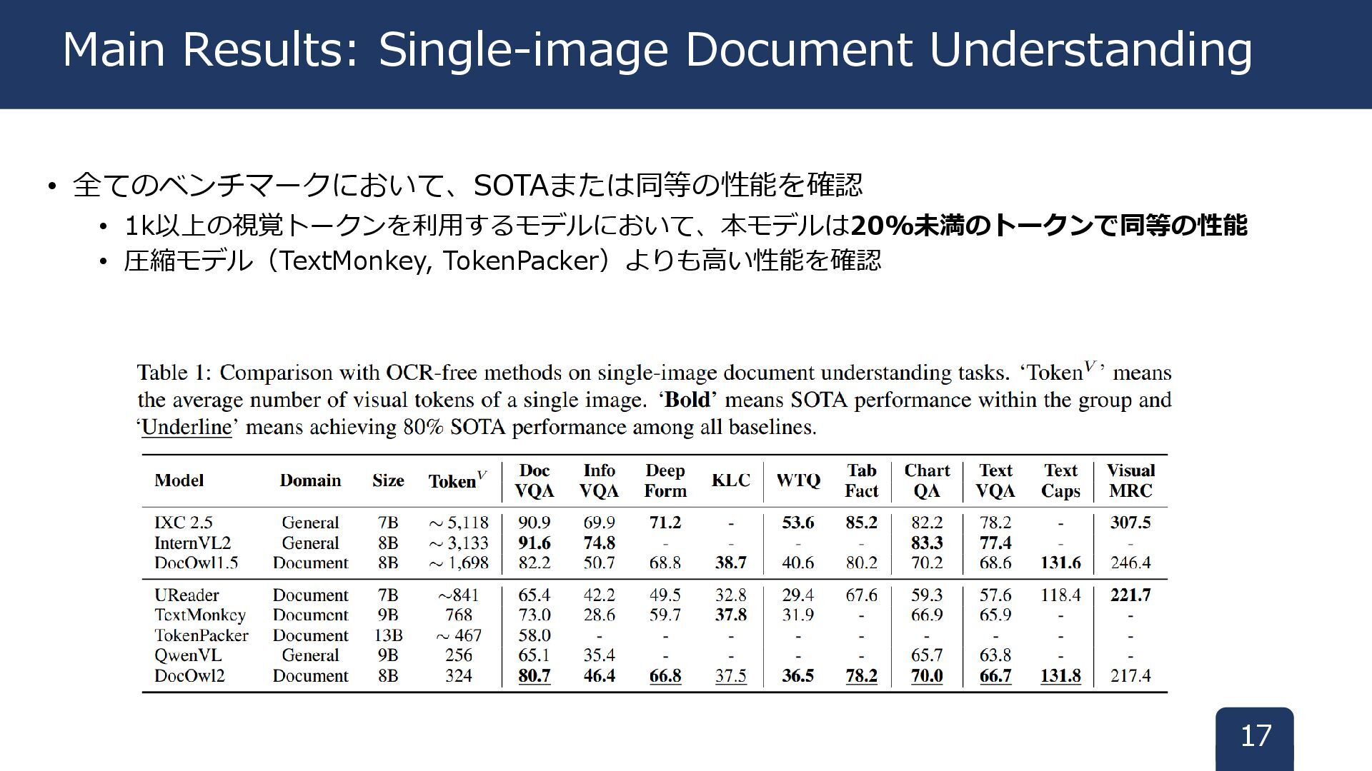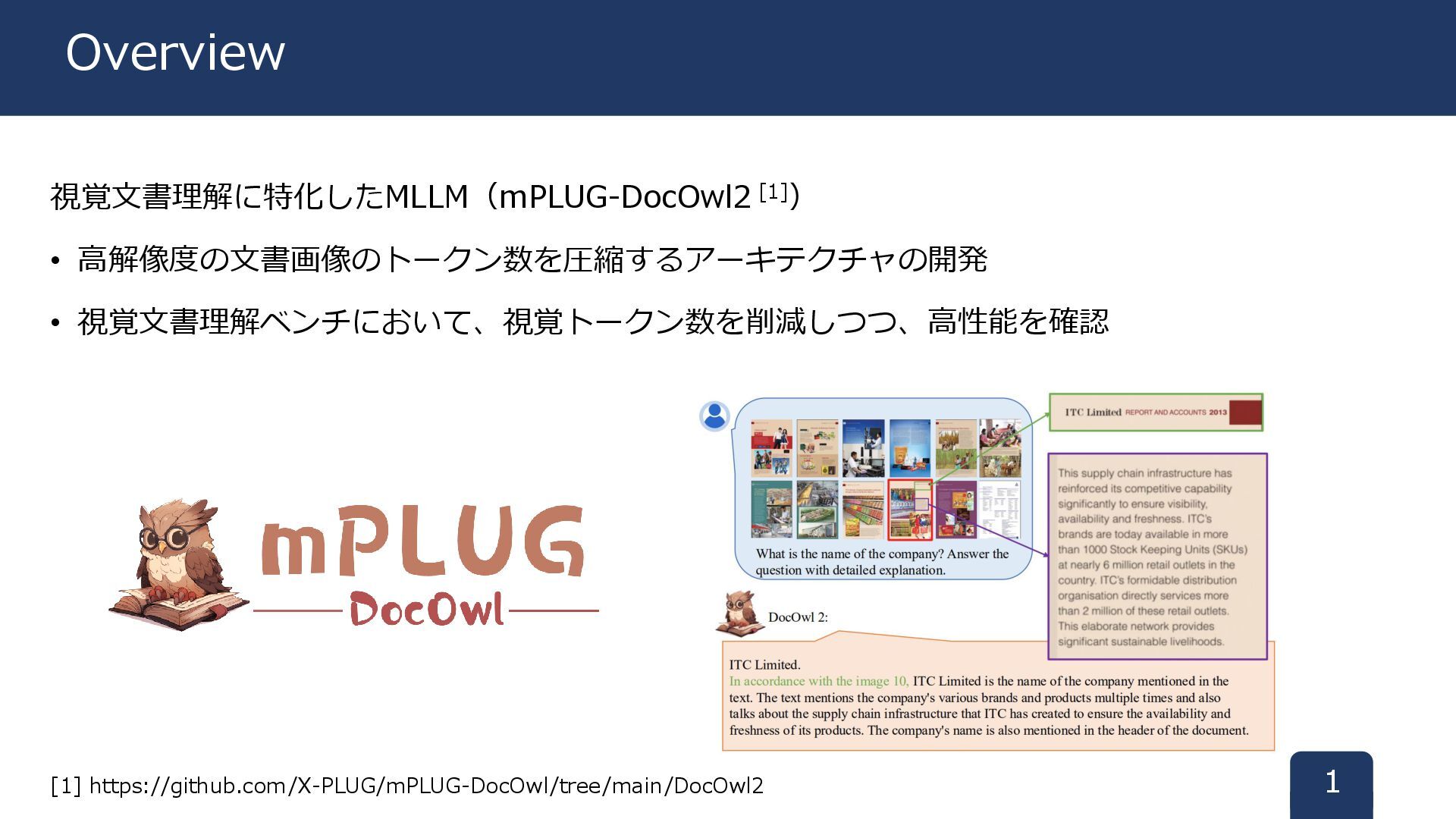 視覚文書理解に特化したMLLM(mPLUG-DocOwl2 [1]) • 高解像度の文書画像のトークン数を圧縮するアーキテクチャの開発 • 視覚文書理解ベンチにおいて、視覚トークン数を削減しつつ、高性能を確認 1 Overview [1] https://github.com/X-PLUG/mPLUG-DocOwl/tree/main/DocOwl2