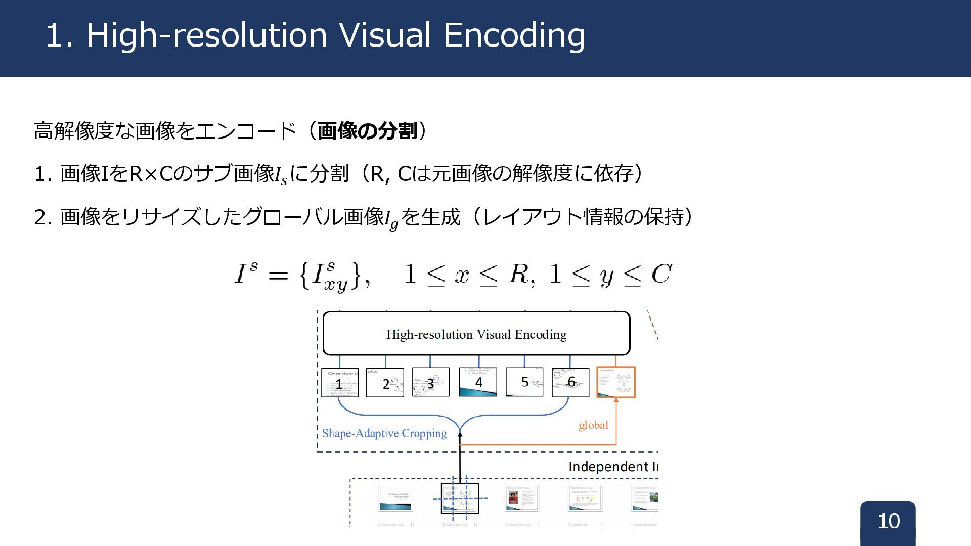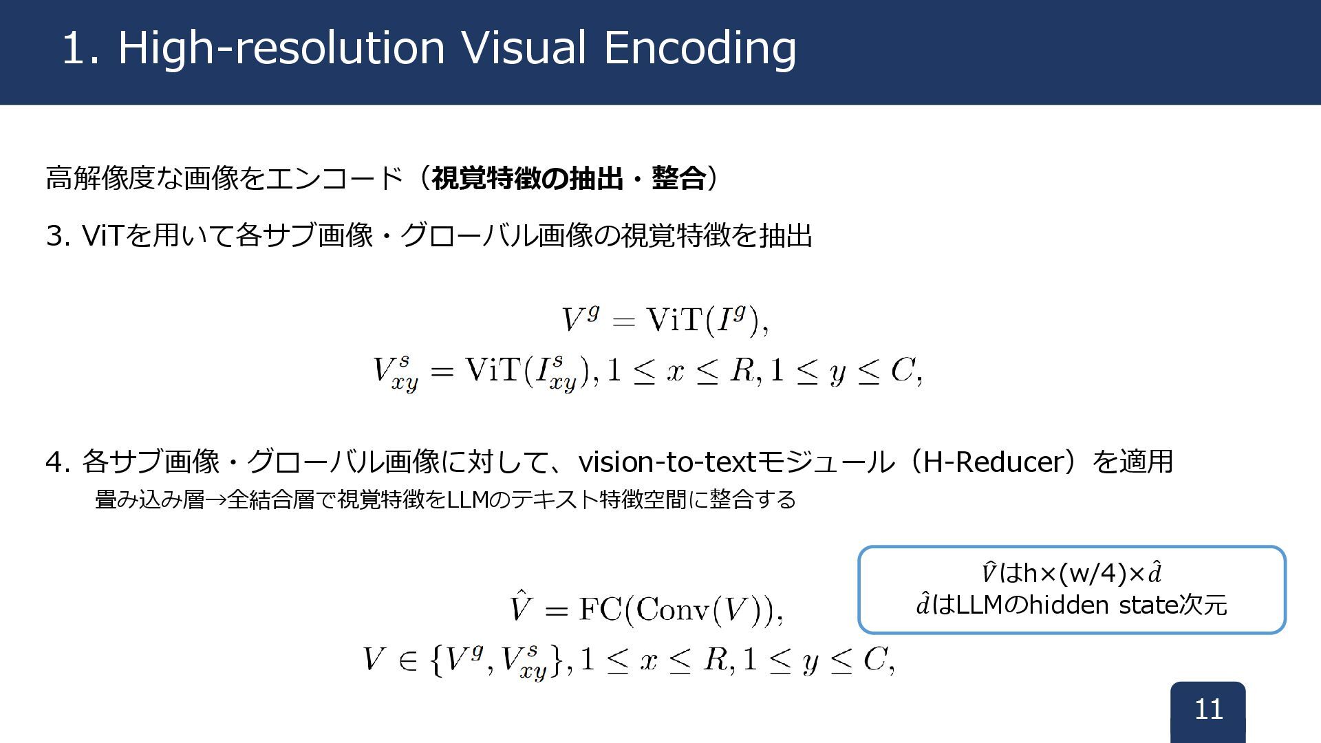 高解像度な画像をエンコード(画像の分割) 1. 画像IをR×Cのサブ画像𝐼𝑠 に分割(R, Cは元画像の解像度に依存) 2. 画像をリサイズしたグローバル画像𝐼𝑔 を生成(レイアウト情報の保持) 10 1.