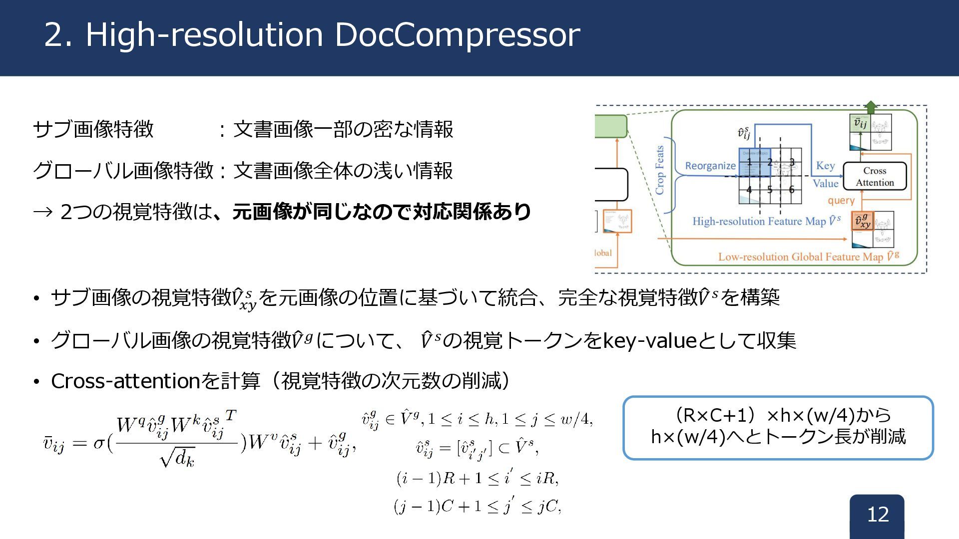 を元画像の位置に基づいて統合、完全な視覚特徴 𝑉𝑠を構築 • グローバル画像の視覚特徴 𝑉𝑔について、 𝑉𝑠の視覚トークンをkey-valueとして収集 • Cross-attentionを計算(視覚特徴の次元数の削減) 12 2. High-resolution DocCompressor (R×C+1)×h×(w/4)から h×(w/4)へとトークン長が削減