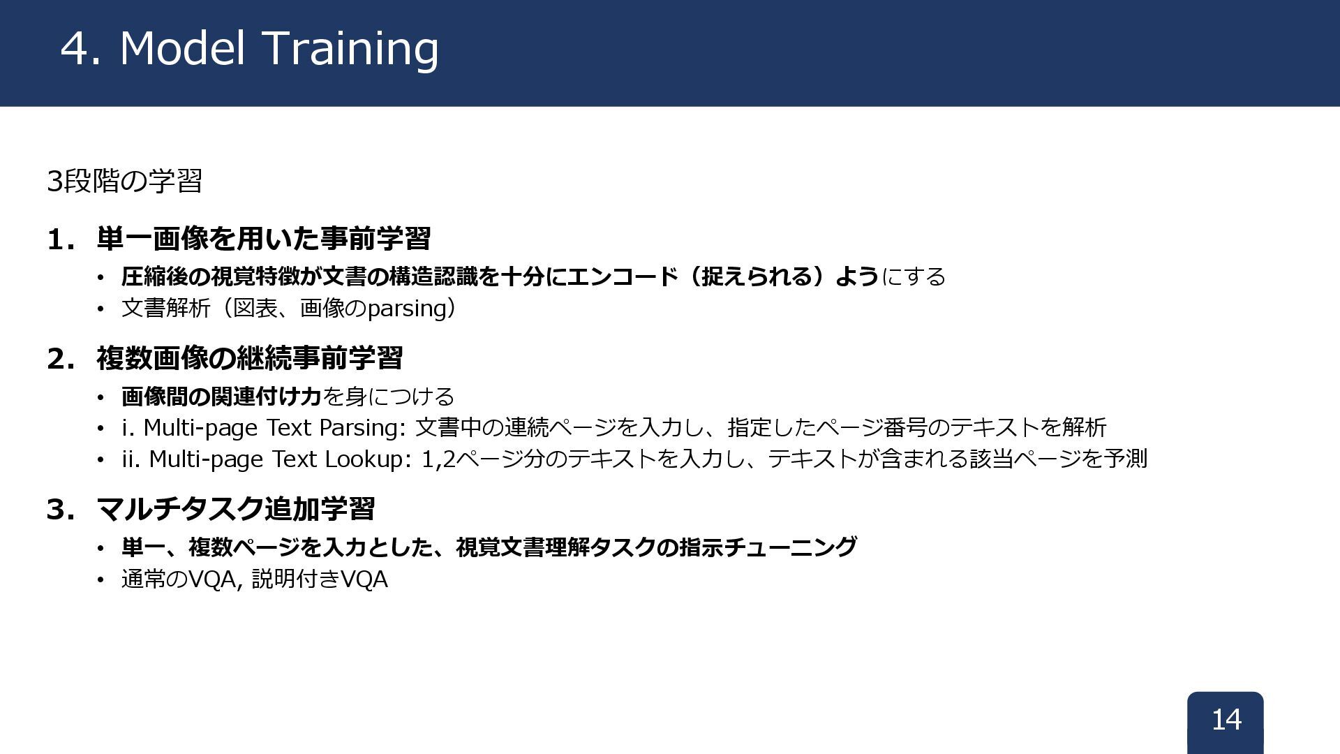画像間の関連付け力を身につける • i. Multi-page Text Parsing: 文書中の連続ページを入力し、指定したページ番号のテキストを解析 • ii. Multi-page Text Lookup: 1,2ページ分のテキストを入力し、テキストが含まれる該当ページを予測 3. マルチタスク追加学習 • 単一、複数ページを入力とした、視覚文書理解タスクの指示チューニング • 通常のVQA, 説明付きVQA 14 4. Model Training