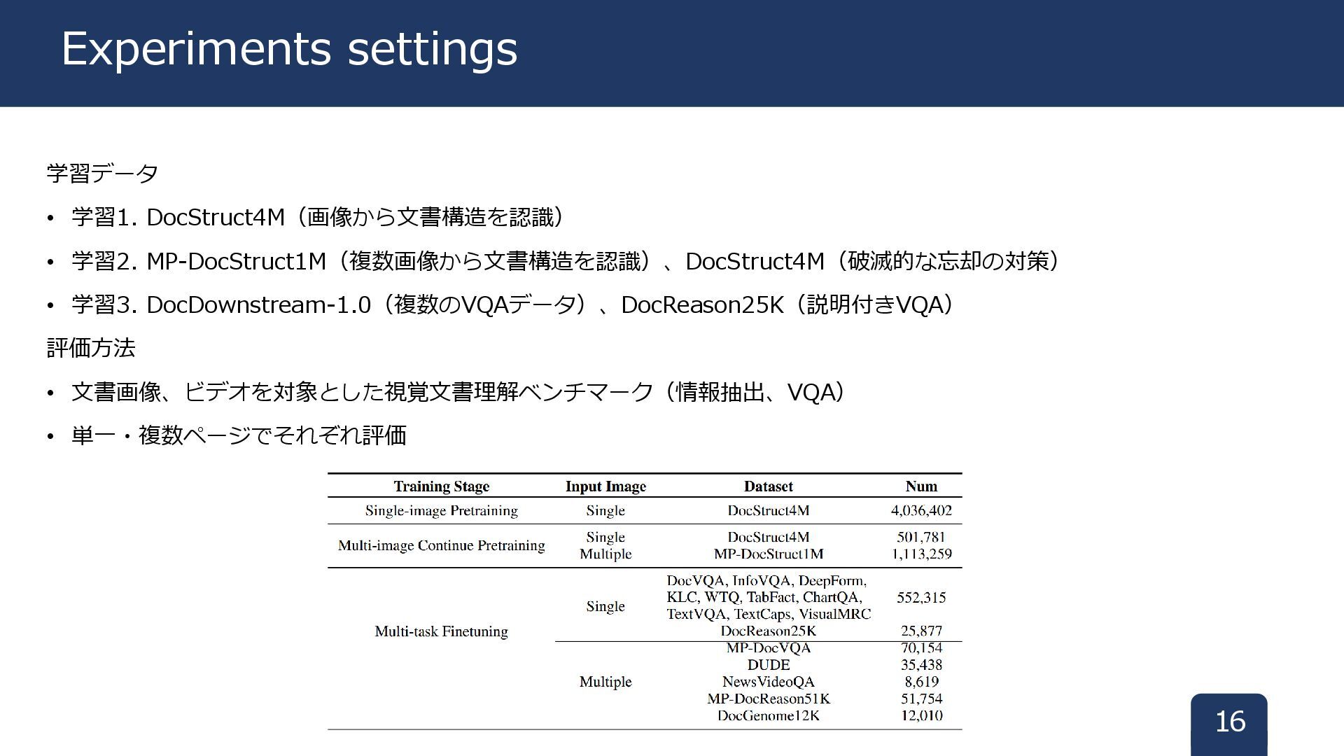 学習データ • 学習1. DocStruct4M(画像から文書構造を認識) • 学習2. MP-DocStruct1M(複数画像から文書構造を認識)、DocStruct4M(破滅的な忘却の対策) • 学習3. DocDownstream-1.0(複数のVQAデータ)、DocReason25K(説明付きVQA)