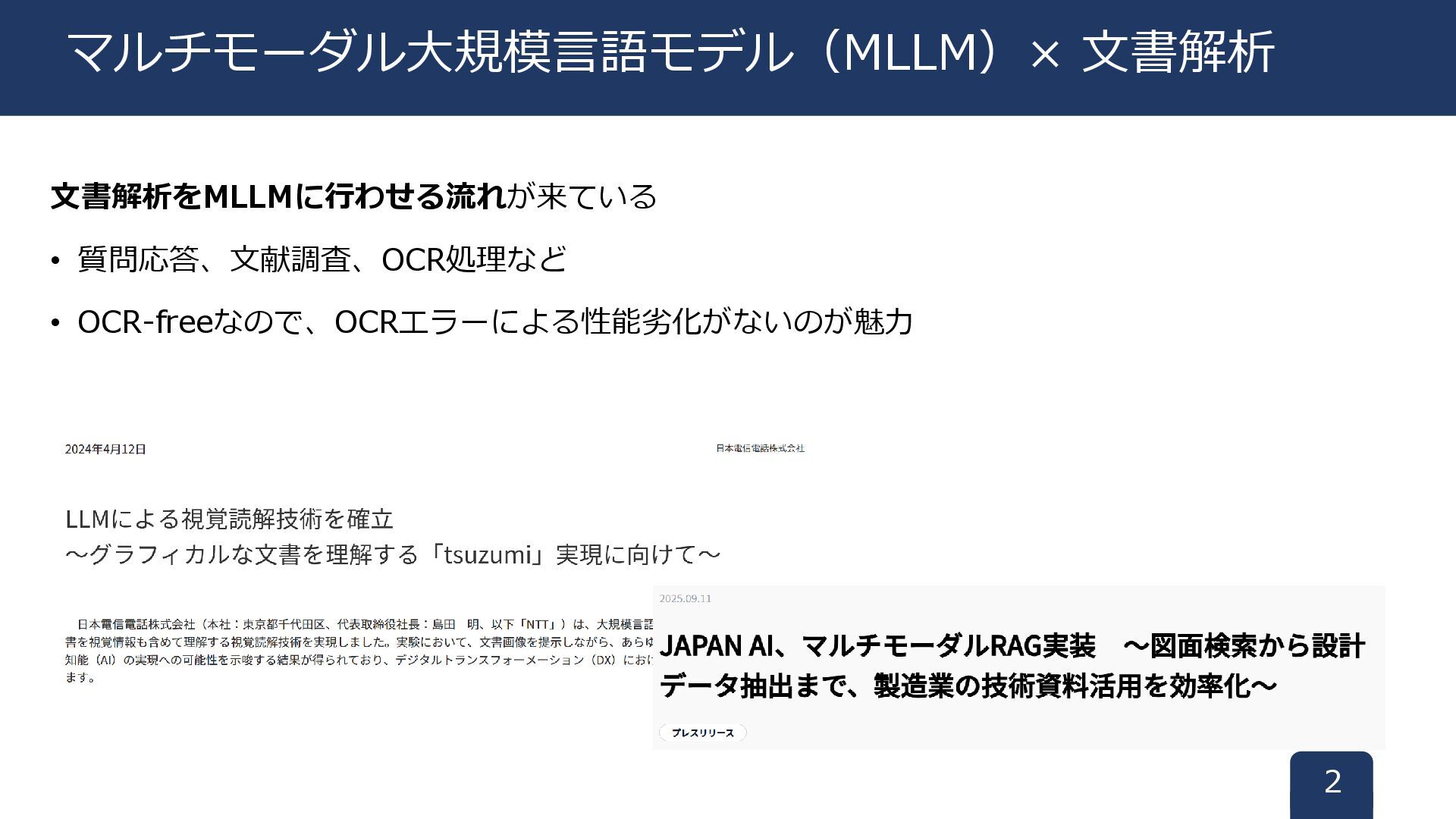 文書解析をMLLMに行わせる流れが来ている • 質問応答、文献調査、OCR処理など • OCR-freeなので、OCRエラーによる性能劣化がないのが魅力 2 マルチモーダル大規模言語モデル(MLLM)× 文書解析