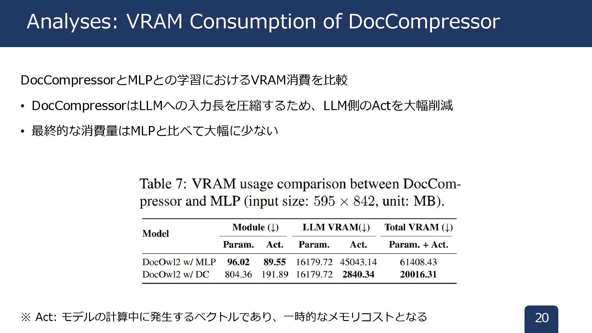 DocCompressor ※ Act: モデルの計算中に発生するベクトルであり、一時的なメモリコストとなる