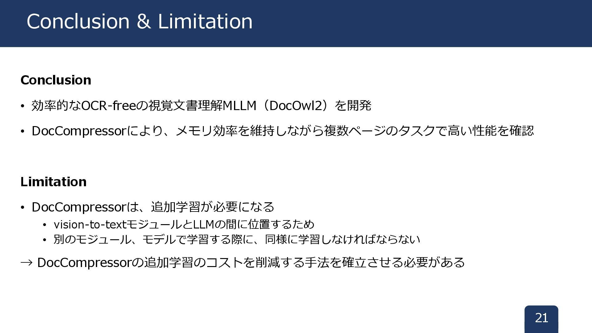 Conclusion • 効率的なOCR-freeの視覚文書理解MLLM(DocOwl2)を開発 • DocCompressorにより、メモリ効率を維持しながら複数ページのタスクで高い性能を確認 Limitation • DocCompressorは、追加学習が必要になる • vision-to-textモジュールとLLMの間に位置するため