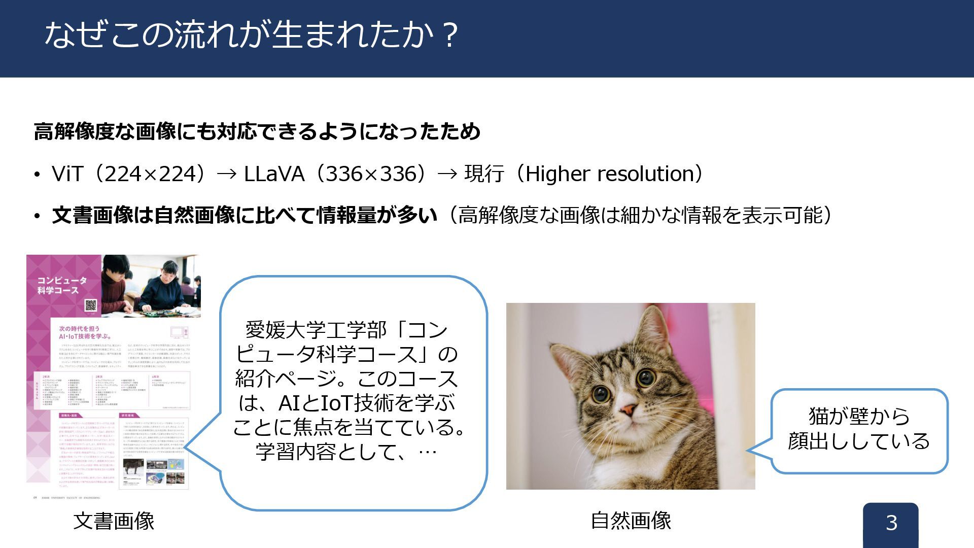 高解像度な画像にも対応できるようになったため • ViT(224×224)→ LLaVA(336×336)→ 現行(Higher resolution) • 文書画像は自然画像に比べて情報量が多い(高解像度な画像は細かな情報を表示可能) 3 なぜこの流れが生まれたか?