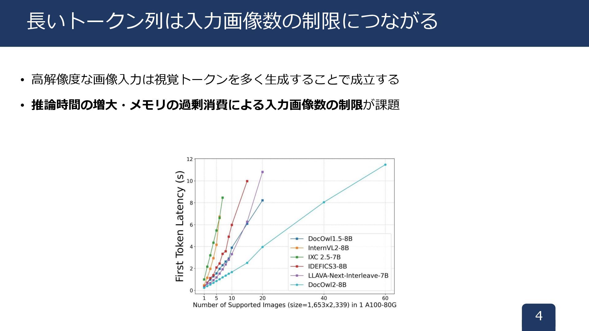• 高解像度な画像入力は視覚トークンを多く生成することで成立する • 推論時間の増大・メモリの過剰消費による入力画像数の制限が課題 4 長いトークン列は入力画像数の制限につながる