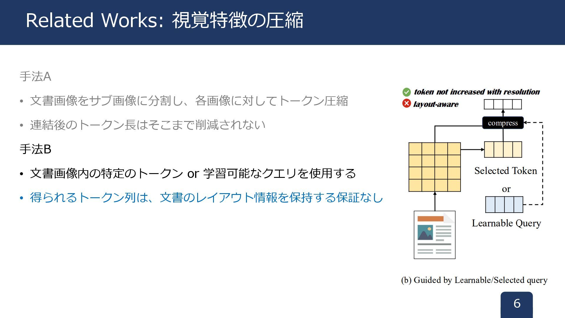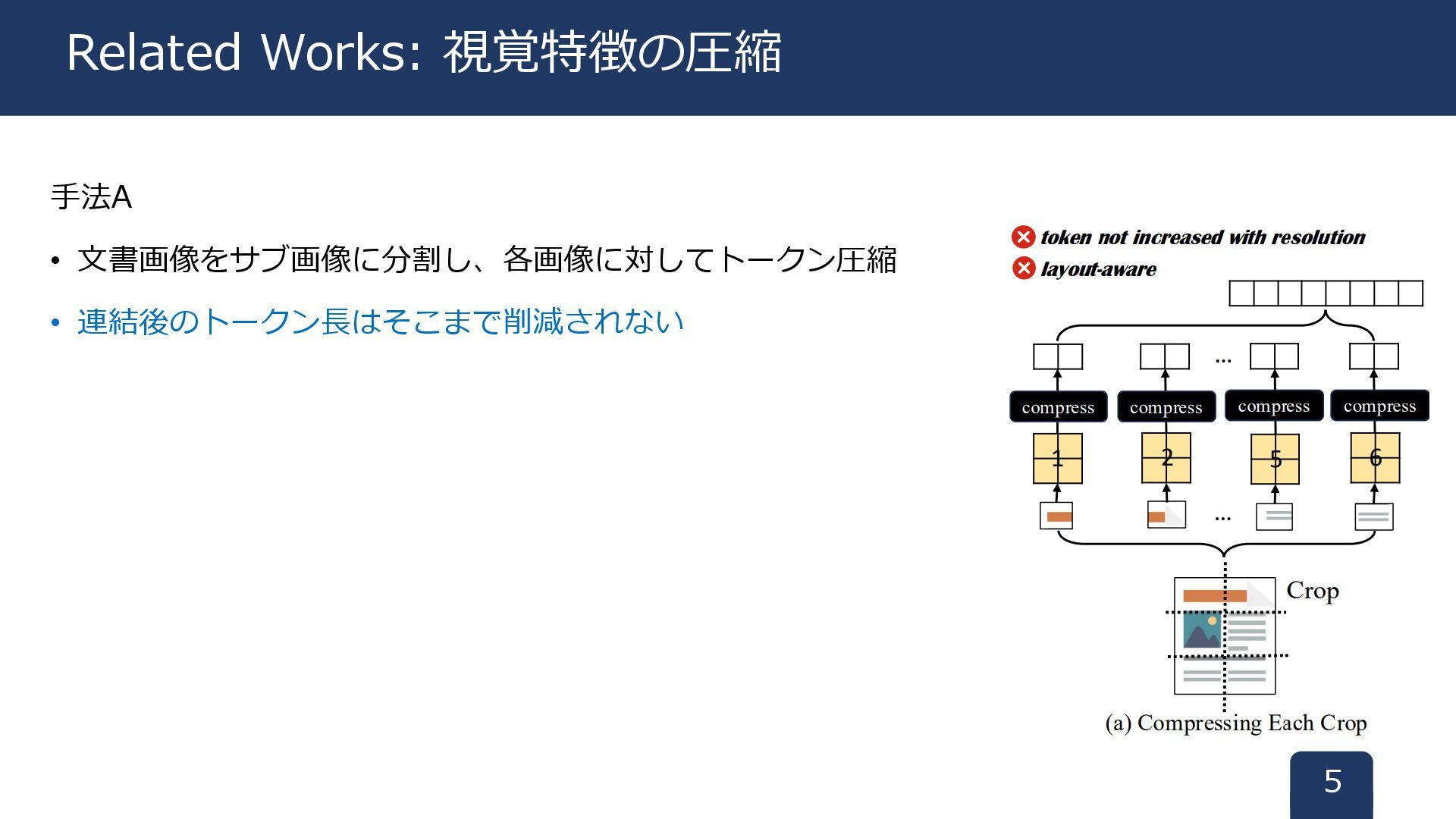 手法A • 文書画像をサブ画像に分割し、各画像に対してトークン圧縮 • 連結後のトークン長はそこまで削減されない 5 Related Works: 視覚特徴の圧縮
