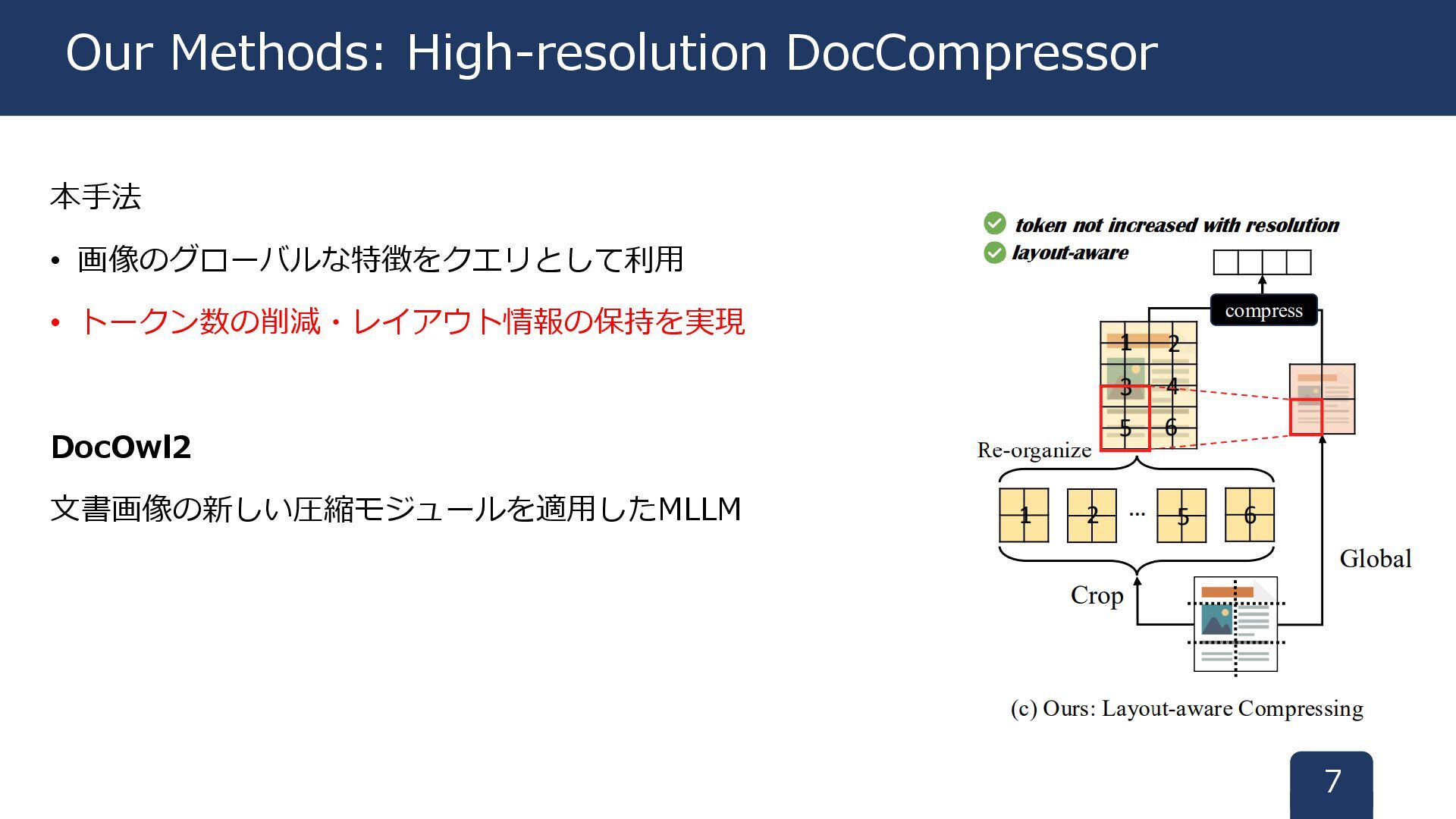 手法A • 文書画像をサブ画像に分割し、各画像に対してトークン圧縮 • 連結後のトークン長はそこまで削減されない 手法B • 文書画像内の特定のトークン or 学習可能なクエリを使用する