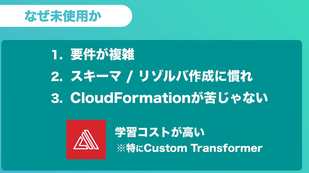 ཁ͕݅ෳࡶ εΩʔϚϦκϧό࡞ʹ׳Ε $MPVE'PSNBUJPO͕ۤ͡Όͳ͍ ͳͥະ༻͔ ֶशίετ͕ߴ͍ ˞ಛʹ$VTUPN5SBOTGPSNFS